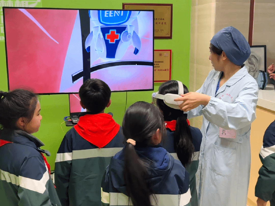 活动现场,学生们分组参与了多维度健康体验:在耳鼻喉科普专区,医生通过VR设备讲解鼻窦结构与鼻炎预防知识,孩子们两两合作,用专业工具观察鼓膜形态,学习正确的耳部护理方法;眼科科普空间里,VR设备模拟出红绿色盲、白内障等视觉状态,让学生直观感受视力问题带来的不便……