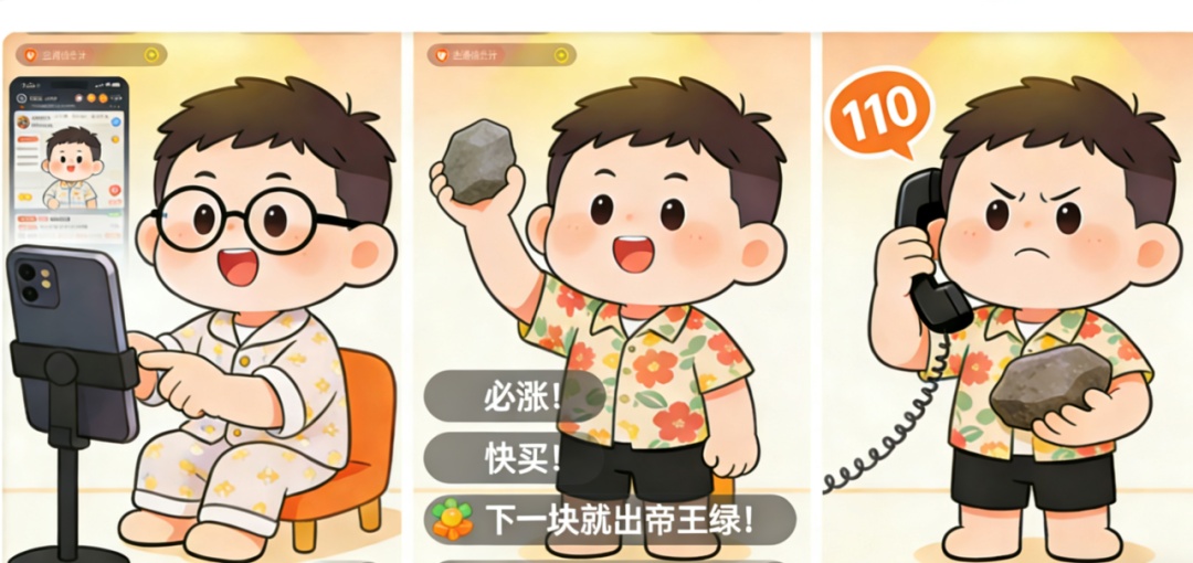 “赌石直播,其实就是我们在后台演的一出戏。”正在服刑的王乙(化名)曾组织此类诈骗,“我们团伙近十人,每人手持多部手机,在直播间里分饰不同网友刷屏。‘今天运气真好,又开出翡翠了!’‘主播专业,跟着他买准没错!’这些话都是提前编好的台词。”