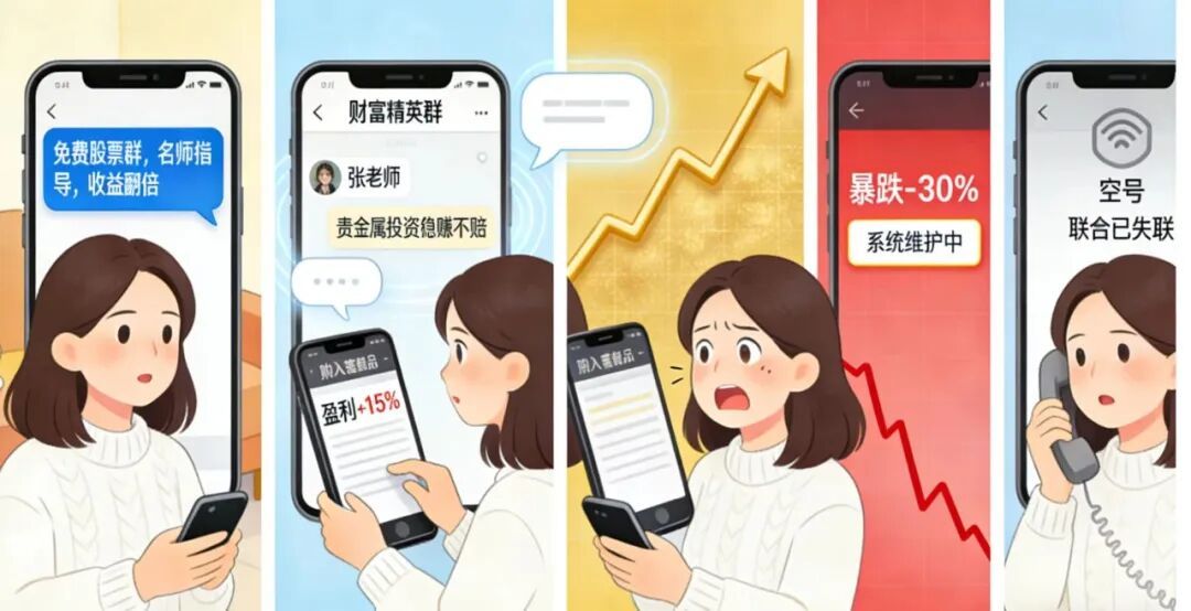 吴丽丽(化名)收到一条广告短信,附有某微信群二维码,声称是股民交流平台。抱着随便看看的心态,吴丽丽扫码入群,发现群内有多名“老师”每日发布链接,免费授课讲解股票。在群里“潜水”多日后,一名“老师”主动私聊吴丽丽,称当前股票行情不佳,另有贵金属等投资渠道,只要投入大量资金便可获得高额回报,并邀请其加入。吴丽丽点击对方发来的链接,下载了某投资软件。数月内,在该“老师”诱导下,吴丽丽逐步追加投资,账面收益可观。然而好景不长,不久价格暴跌,收益缩水,吴丽丽随即申请赎回,仅收到两笔回款后,平台便无法登录,相关联系人也全部失联。