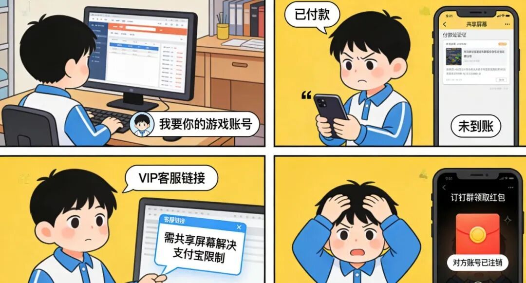 某高校学生江侠(化名)通过某二手平台售卖游戏账号,一买家主动搭讪。经过一番“讨价还价”,买家同意购买,并出示付款凭证截屏称已付款,但江侠始终未收到钱款。此时,买家“热心”帮其分析未到账原因,在多种尝试无果后,提供了一条链接,声称可接入“VIP客服”快速处理。江侠点击链接后,“客服”以解决支付宝账号限制为由,诱使其开启屏幕共享,并加入某办公软件的群聊发放红包,承诺随后返还。一周后,江侠仍未收到退款,再联系买家时发现已被拉黑,账号也已注销。