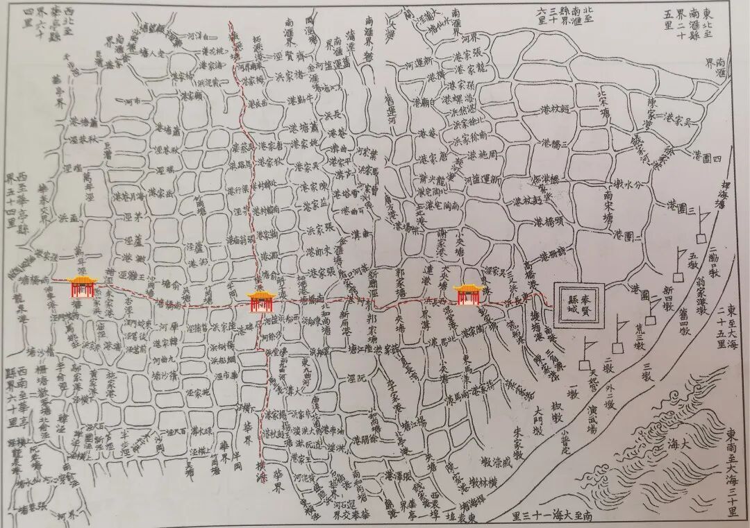 底图为清光绪初年《奉贤县水利总图》,来源于《奉贤县图照志》;红色古镇标记分别为庄行、南桥、青村的大概位置