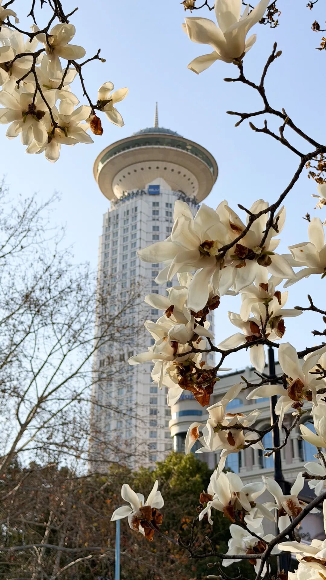 当白玉兰的纯白还在人民广场上空勾勒天际线,紫玉兰已悄然点燃枝头的“粉紫火焰”。这对木兰科的姐妹花,一白一紫,在人民广场演绎着春日二重奏。
