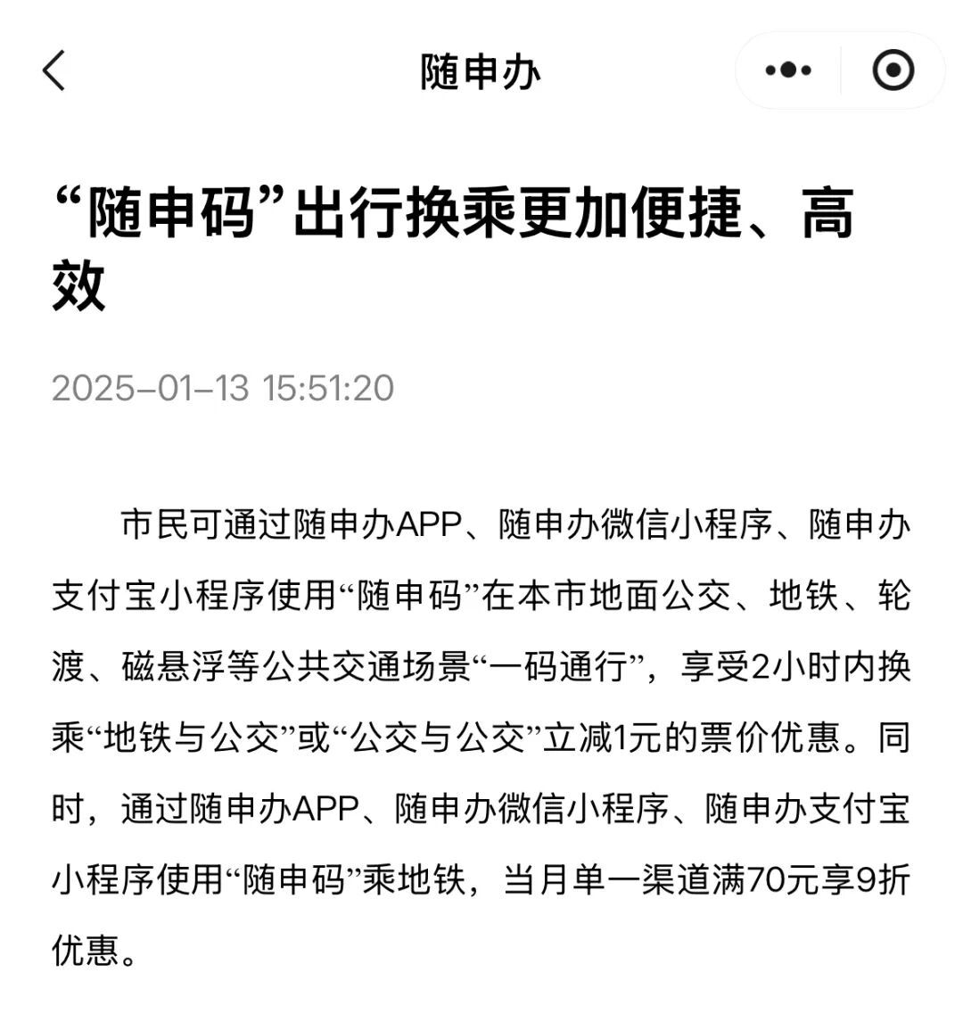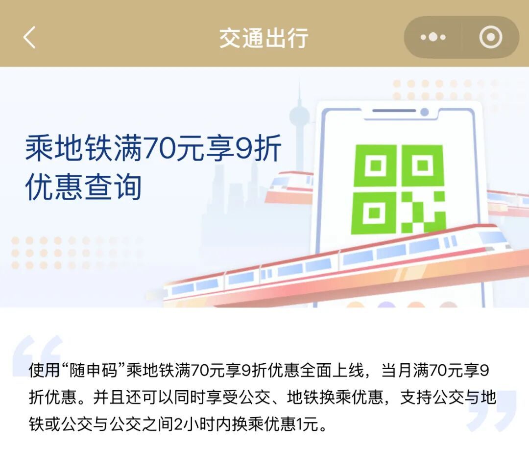 使用“随申码”乘地铁,当月满70元享9折优惠。