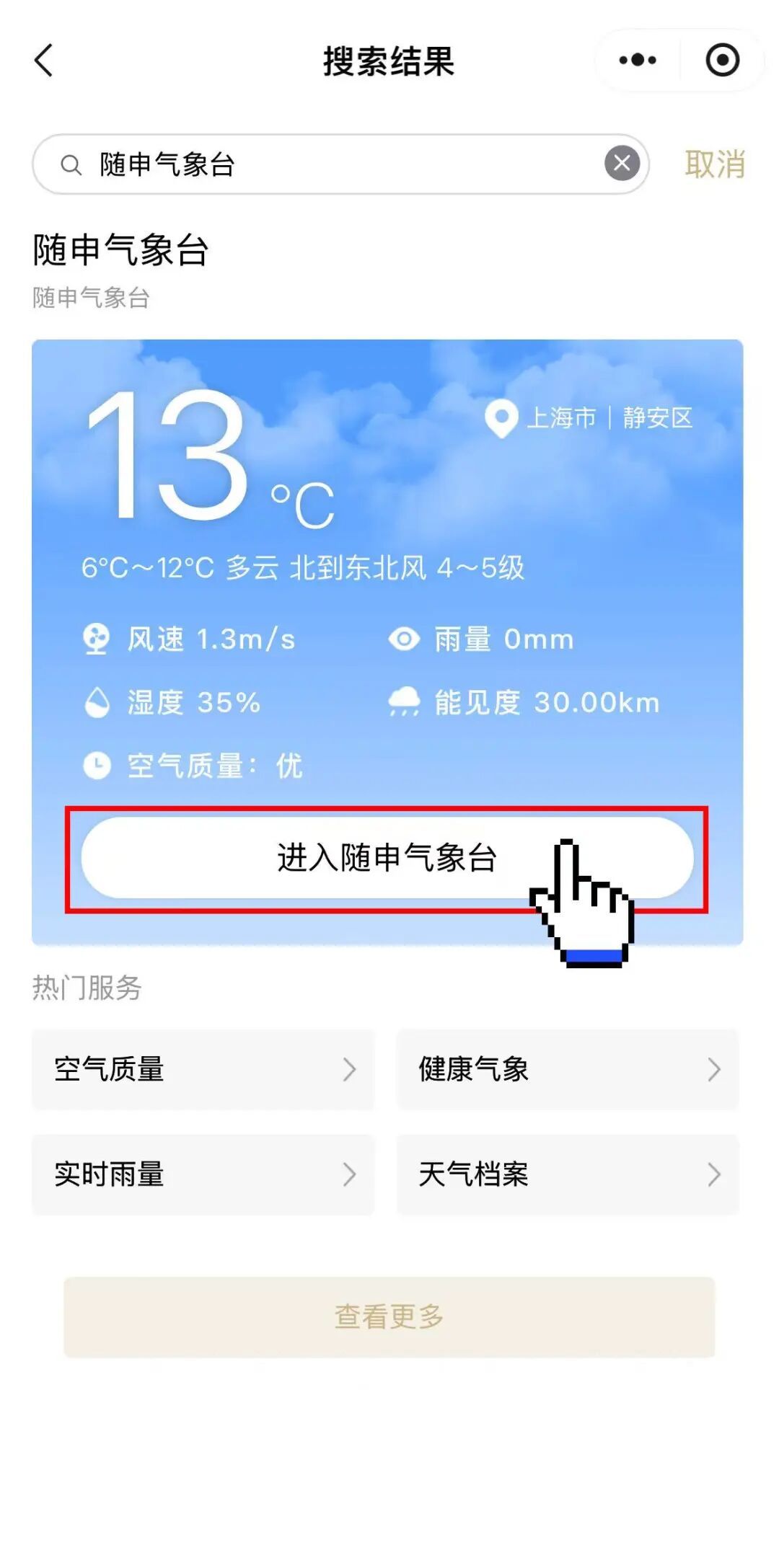 打开“随申办市民云”(APP/微信小程序/支付宝小程序),首页搜索进入“随申气象台”服务,了解一周天气情况,提前做好出行计划。