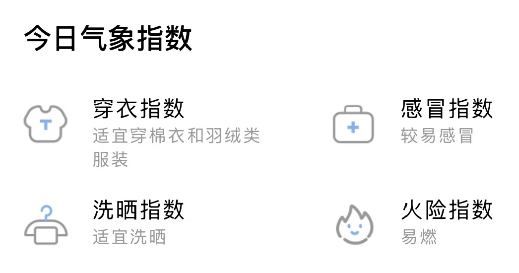 气象台服务还会根据每日的天气情况,更新穿衣、感冒、洗晒、火险四个方面的气象指数,大家可以根据气象指数安排你的春日氛围感穿搭,分分钟搞定朋友圈大片~