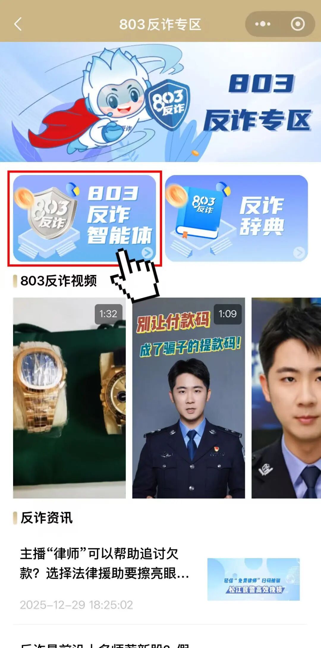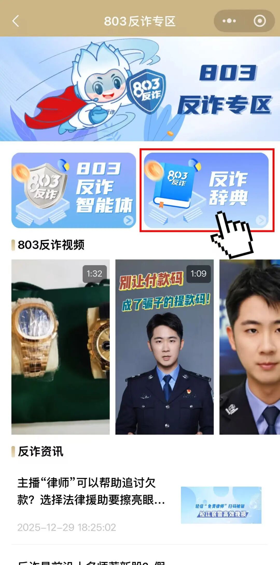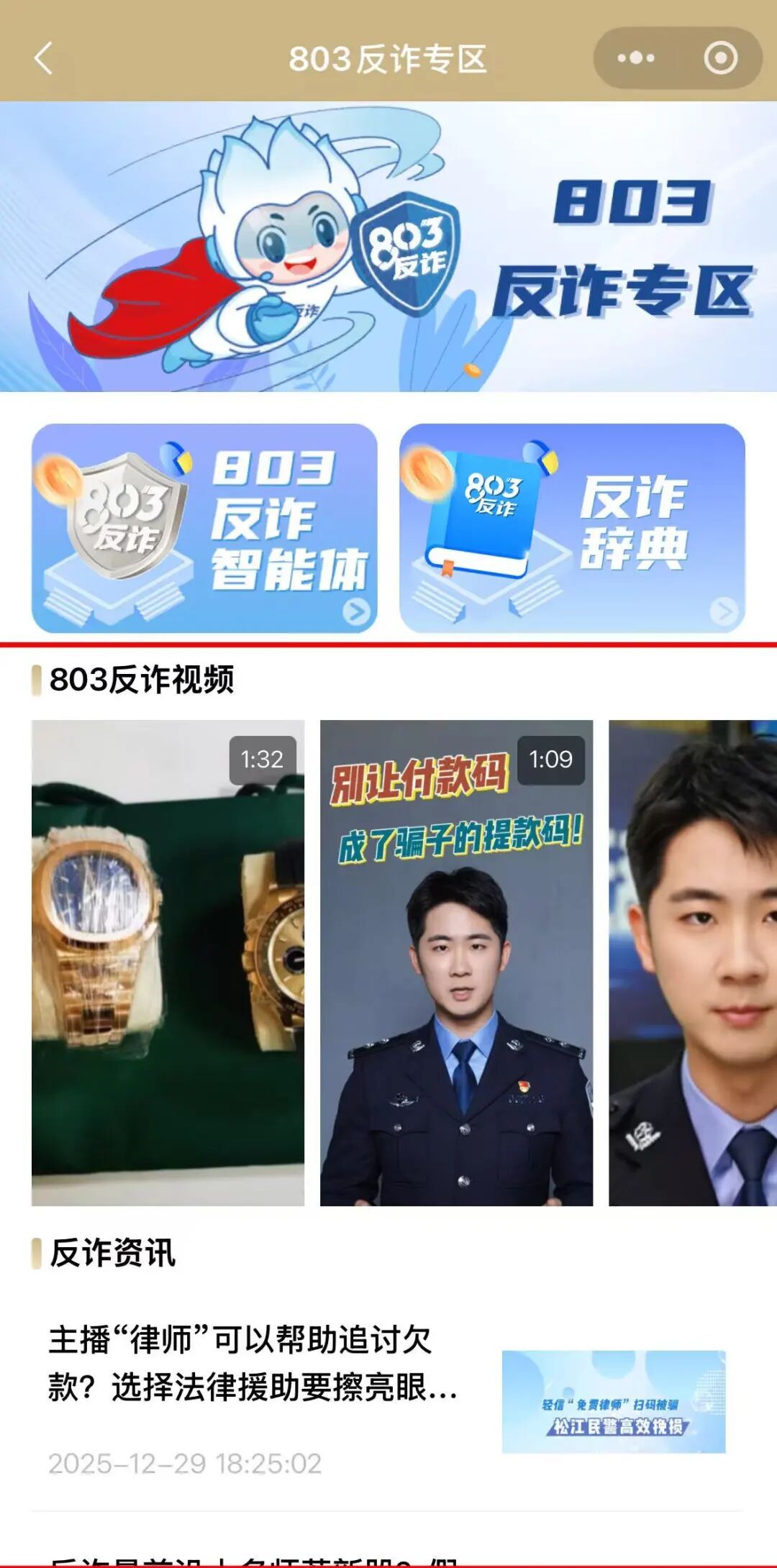 “803反诈专区”整合了反诈问答智能体、反诈资讯和反诈辞典三大核心模块。