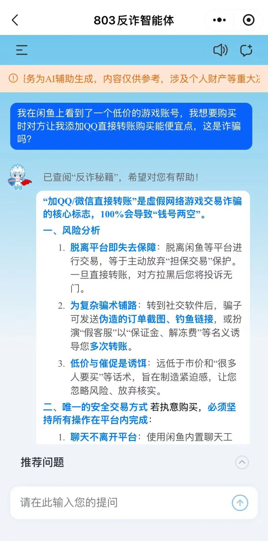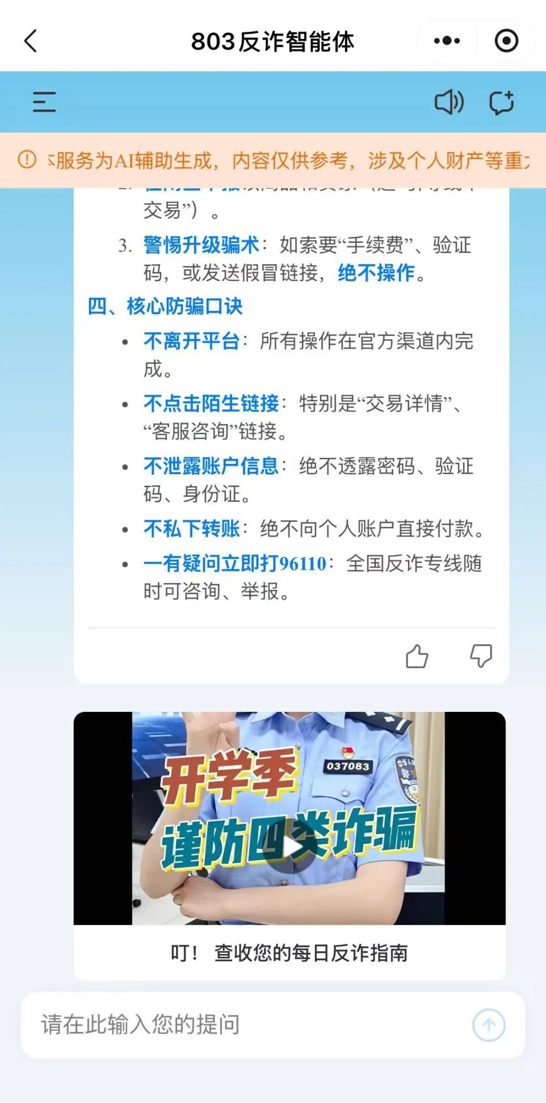 同时智能体还支持实时播报回答,并根据问答内容关联推送“803反诈”视频号内容,帮助大家更直观地理解诈骗手法。