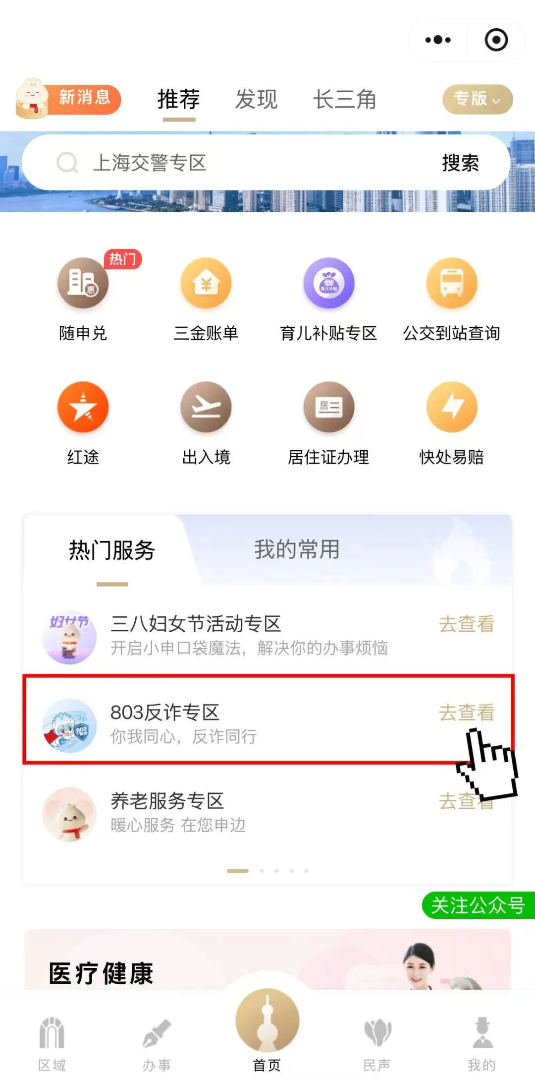 打开“随申办市民云”(APP/微信小程序/支付宝小程序),在首页“热门服务”栏目中找到“803反诈专区”,点击进入即可使用。