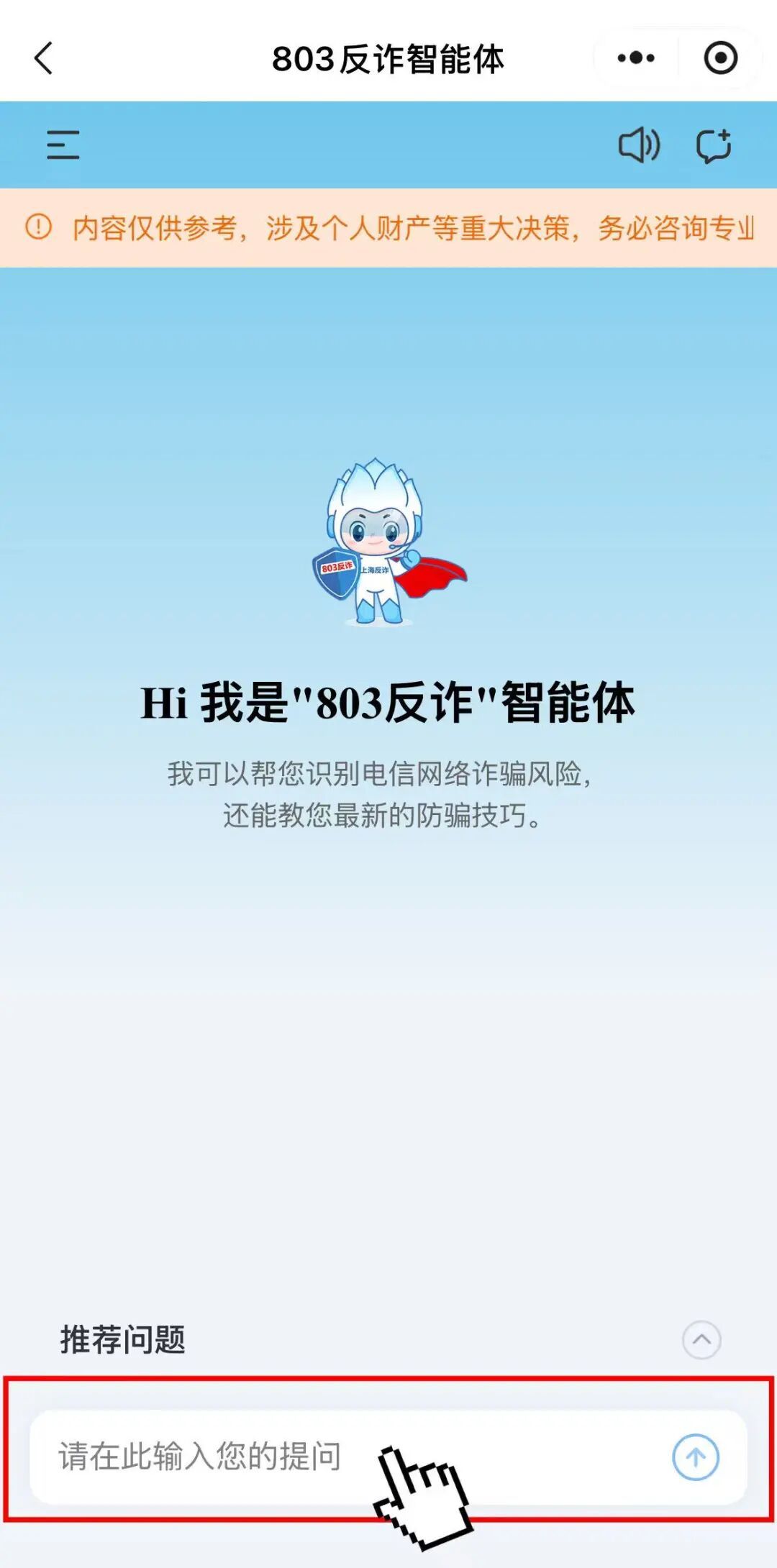 此外,小申还为各位市民精心准备了一份具有真正意义的反诈服务——“803 反诈” 智能体,无论您遇到什么事情,只需告诉它,就能快速识别是否为诈骗、明确诈骗手法,为防范电信网络诈骗添上 “科技护盾”。