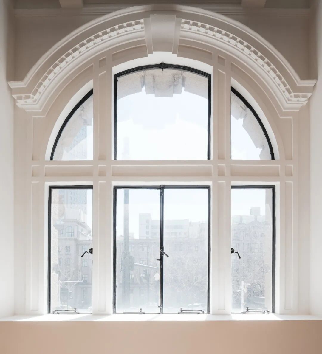 在空间清理的过程中,窗洞周边精美的历史窗套意外重现。设计方案立刻调整,后退周边吊顶,对不同时期留存的窗套、各异的窗户划分方式原貌保留,不统一拆除、不仿制添加,让历史的层次感与岁月的脉络,在空间中清晰可辨。将时光遗忘的细节与建筑沉淀的印迹,在视野里完整还原。经过多轮精密的尺度推敲,使现代纯净感的展厅与经典装饰的历史老建筑达成完美的美学平衡。