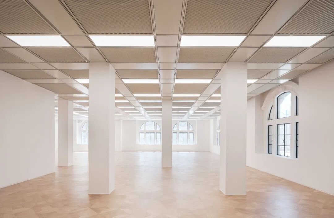 秉持可持续的设计理念,最大限度地保留了建筑原有吊顶系统,减少不必要的改动与浪费,同时结合展陈照明专业需求,在原有吊顶中巧妙嵌入平板灯,搭配定制灯膜系统与天花轨道装置打造层次丰富的照明体系,以模拟自然光的柔和光线平衡历史建筑的空间质感与现代艺术的展陈需求,既为艺术作品呈现提供专业适宜的照明支持,清晰展现展品细节,又有效消解了原有金属吊顶的视觉厚重感,让光线成为连接历史与当代的纽带,为百年空间注入轻盈与灵动的当代气息。