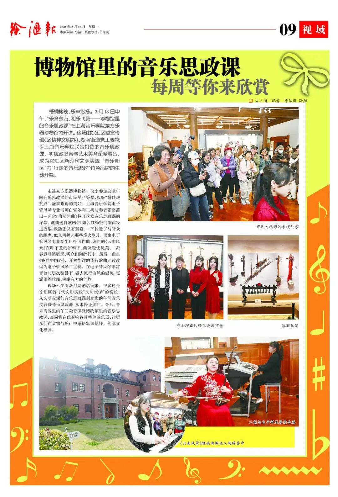 3月13日午间,一场由徐汇区委宣传部(区精神文明办)、湖南街道党工委与上海音乐学院携手打造的音乐思政课,在东方乐器博物馆内拉开序幕。《红梅随想曲》《江姐》唤起烽火记忆,《云南风景》流淌盎然春意,《我的中国心》经管风琴演绎更显雄浑壮阔——熟悉旋律焕发新意,直抵人心。从夜课到午间美育,弦歌不辍,让听众在文物与乐声中感悟家国情怀、传承文化根脉。