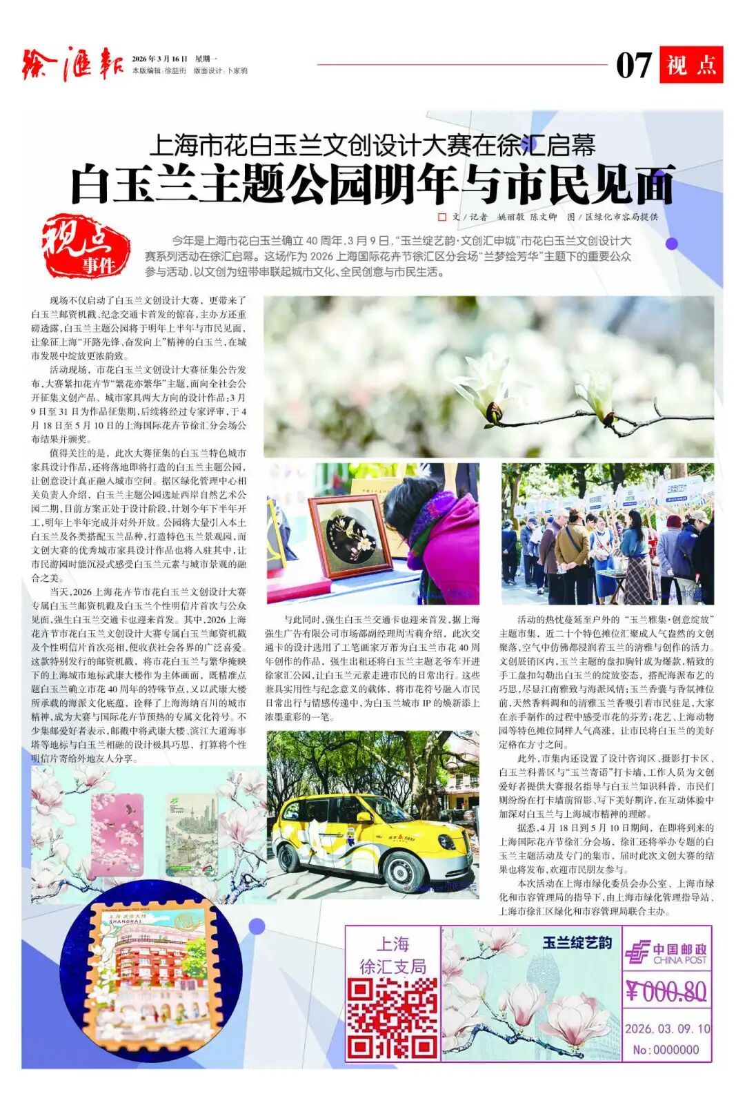 今年是白玉兰被确立为上海市花40周年。“玉兰绽艺韵·文创汇申城”设计大赛近日在徐汇启幕,公开征集文创产品与城市家具的设计佳作,获奖作品将落地明年开放的白玉兰主题公园。据悉,大赛专属邮资机戳、个性明信片已惊喜亮相,强生白玉兰交通卡也首发登场,让市花融入市民日常出行与情感传递。象征上海“开路先锋、奋发向上”精神的白玉兰,正伴着春意,在城市发展中绽放得韵致更浓!