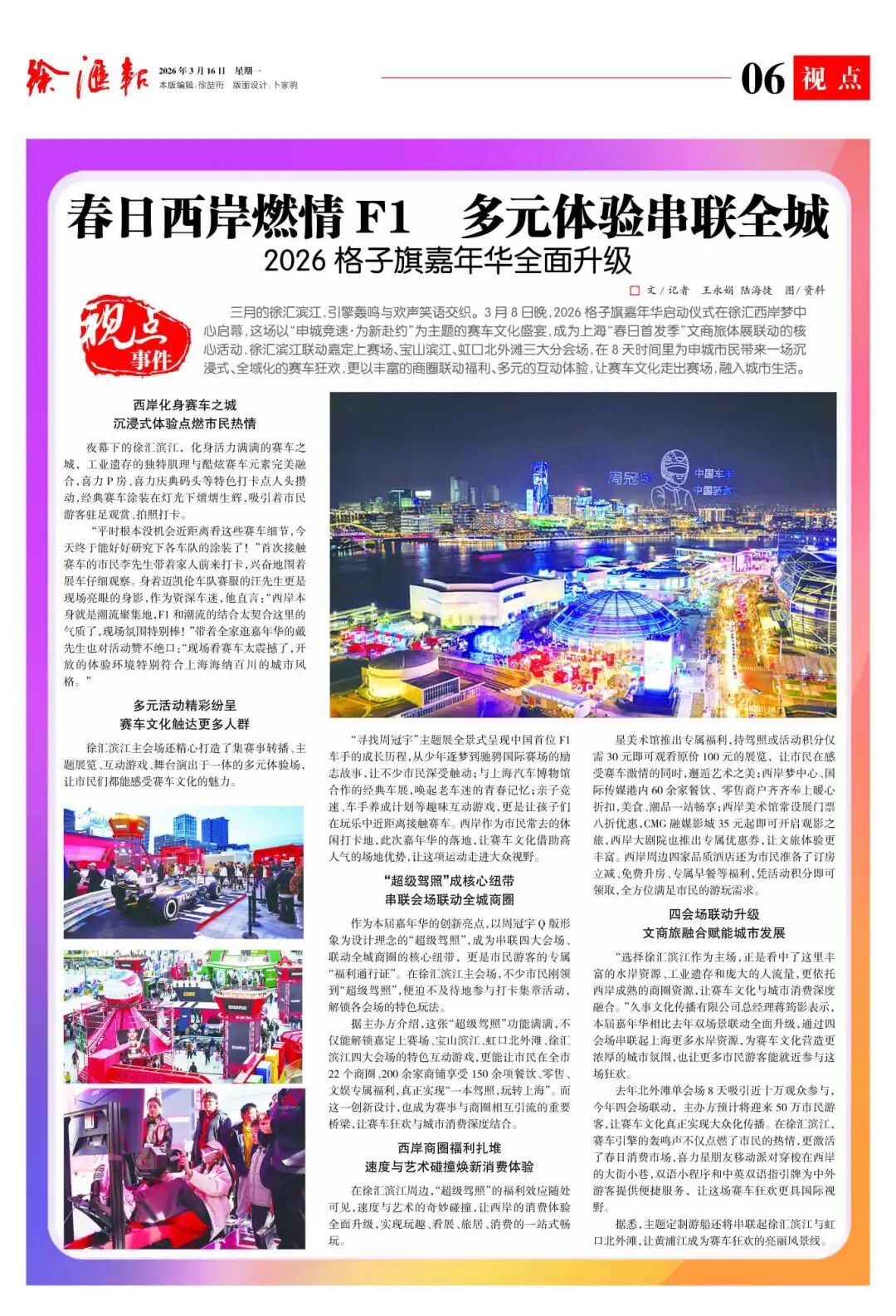3月8日晚,2026格子旗嘉年华在徐汇西岸梦中心燃情启动,“申城竞速·为新赴约”主题狂欢席卷全城。四大会场联动、22个商圈加持,“超级驾照”打卡赛车文化、解锁专属福利,让速度与激情触手可及。这场盛宴预计将吸引50万市民游客,激活春日消费市场。F1引擎轰鸣,化作城市发展的强劲脉动,为上海注入新活力!
