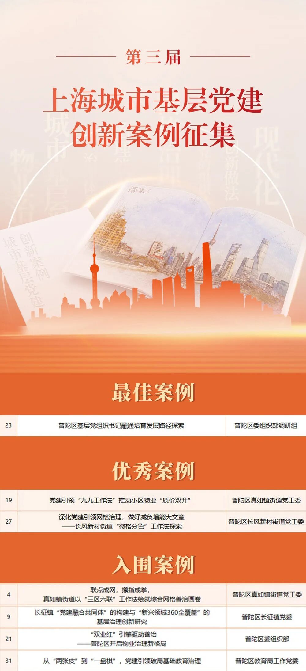 近日,第三届上海城市基层党建创新案例征集活动推荐案例名单正式发布。普陀区共有7个案例从全市申报案例中脱颖而出,荣获最佳案例1个、优秀案例2个、入围案例4个。 第三届上海城市基层党建创新案例征集活动于2025年4月启动,由中共上海市委组织部指导,中国共产党新闻网、人民网、中共上海市委党校共同主办。活动历时近一年,旨在挖掘和展示上海党建引领基层治理的新成果、新模式。普陀区委组织部高度重视此次活动,精心组织、广泛动员,第一时间下发征集通知,组织全区各级党组织积极参与,累计报送案例32篇。经过初评、复评、调研等环节的激烈角逐,普陀区7个案例荣获推荐。一起来看看这些获奖案例的精彩内容! 面对居民区、街区、楼宇园区党组织书记队伍建设存在的发展不均衡问题,普陀区委组织部深入开展调研,探索书记队伍“融通培育”新路径。报告精准分析了基层党组织书记在能力特质、人事管理等方面的差异与短板,并从人事管理、结构优化、培育模式三方面提出系统性建议:建立全域覆盖的编制岗位体系,打通跨领域流动的制度壁垒;构建分层分类的考评激励机制与多元选拔渠道;打造“理论+实践”“大梁带小梁”的融通培育模式,培养一支懂治理、能融通、善作为的高素质基层“头雁”队伍,为提升基层治理现代化水平夯实人才基础。 真如镇街道以恒力锦沧花园小区为“试验田”,探索形成了党建引领物业费调价的“九九工作法”。面对物业费20年未涨、服务滑坡、居民不信任的僵局,居民区党总支跨前一步,将党的组织优势贯穿于调价全过程,为破解住宅小区治理难题提供了可复制的操作范本。 长风新村街道直面“新旧融合”的治理结构性矛盾,以党建为引领创新“微格分色”工作法,以精细化治理回应多元群体诉求,走出基层精准服务新路径。用“分色”建立需求图谱,实现服务供给与需求精准匹配,完成从粗放走访到精准服务的转型,为破解超大城市治理共性难题提供了实践参考。 真如镇街道兰溪综合网格是涵盖老小区、新楼宇,融合居民区、街区、楼宇(园区)的复合型网格,通过创新实践“三区六联”工作法,结合群众需求搭建趣缘平台,将“网格点”联结成“朋友圈”,依托队伍优势开展联治,高效破解疑难及“三跨”问题,推动网格从生人社会向熟人社会转变。 普陀区长征镇立足超大城市基层治理需求,在全市率先成立街区党支部,做实党群服务阵地,通过“走过去+引过来”精准链接街区商户群体,实现组织、区域、人群全覆盖,有效强化了党建政治引领与服务功能,推动形成多元协同治理格局,为新兴领域党的组织体系全覆盖和基层治理现代化提供了实践经验。 普陀区深入贯彻市委关于党建引领物业治理的重要指示精神,锚定“双业红”三年行动计划,抓好物业服务“质价双升”、业委会规范化建设、重点小区底部抬升等关键环节,着力破解物业治理难题,有效推动了“三驾马车”同向发力,蹚出了一条党建引领下物业治理提质增效的新路子。 普陀区教育工作党委直面基础教育领域党建与业务“两张皮”的治理困局,创造性构建了“123456”深度融合体系(即一个融合目标、两个融合特点、三个融合聚焦、四个推动主体、五大融合项目、六条建设路径),锚定“以高质量党建引领高质量发展”一个目标,突出系统思维与实践导向两个特点,为破解基础教育治理难题提供了借鉴和启发。