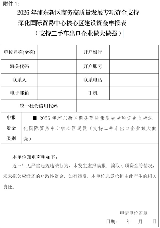2026年浦东新区商务高质量发展专项资金支持深化国际贸易中心核心区建设资金申报表(支持二手车出口企业做大做强);