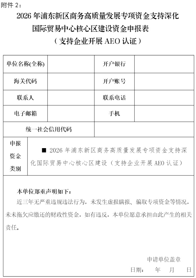1、2026年浦东新区商务高质量发展专项资金支持深化国际贸易中心核心区建设资金申报表(支持企业开展AEO认证);