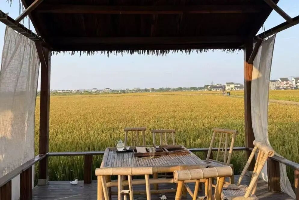 在奉贤李窑村,一家由农具仓库改造的咖啡馆取名“无忧闲院”,落地窗外就是成片稻田。去年秋天,为了留住这片“稻田景观”,村里特意推迟了收割时间——因为对咖啡馆来说,稻田是风景,是情绪,更是“出片率”。