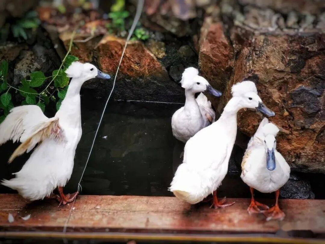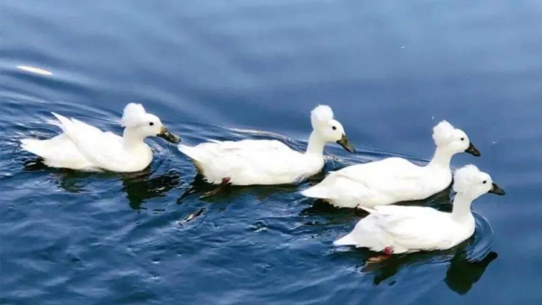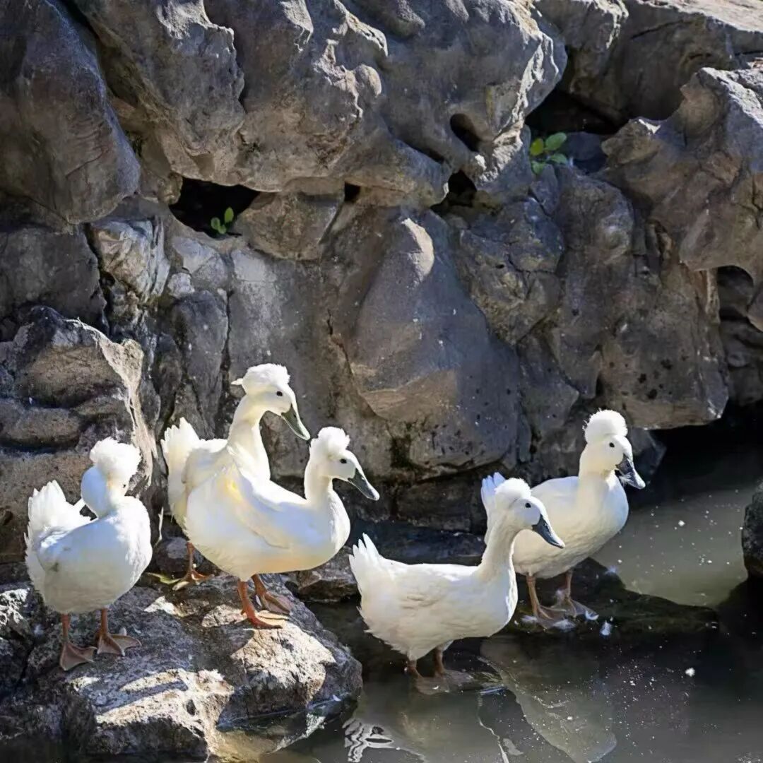 这种鸭子通体雪白,乌嘴黄脚,最显著的特征是头顶一簇高耸蓬松的白色羽冠,形如凤冠,因而得名“凤头白鸭”。它们气质优雅,既具天鹅之姿,又不失家鸭之趣,在池水间缓游嬉戏,常引得游客驻足拍照。