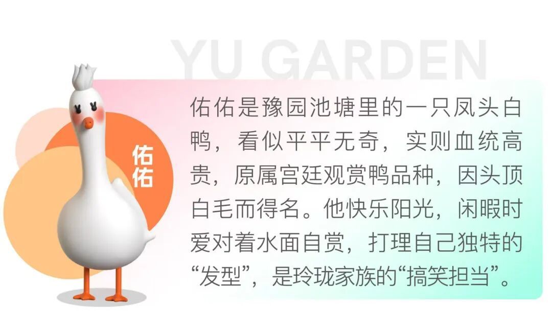 如今,这些凤头白鸭主要栖息于玉玲珑前的积玉水池一带,晴日里常结伴游弋,憨态可掬,成为游客争相观赏的对象。它们也被纳入豫园“玲珑家族”吉祥物IP体系,命名为“佑佑”,寓意“福佑”,象征幸福与庇护,进一步拉近了传统文化与年轻游客的距离。
