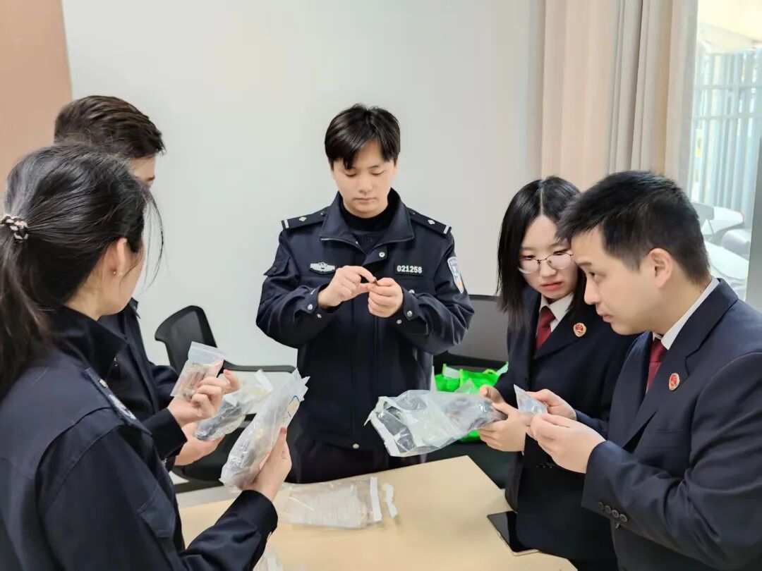 检察官与公安干警一同查看扣押的在案证物