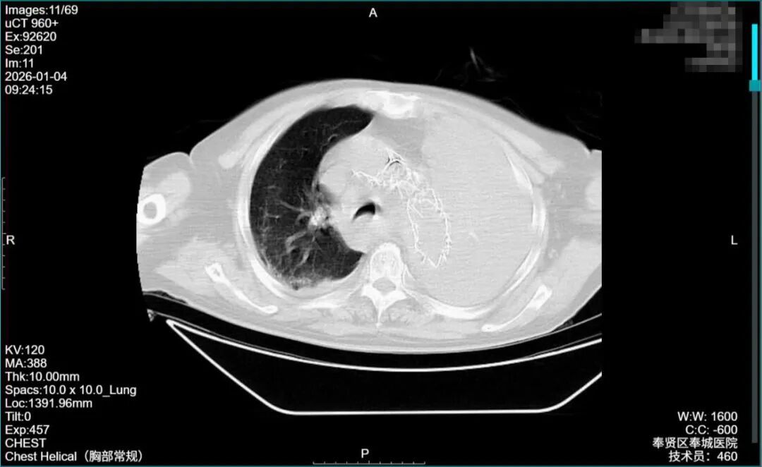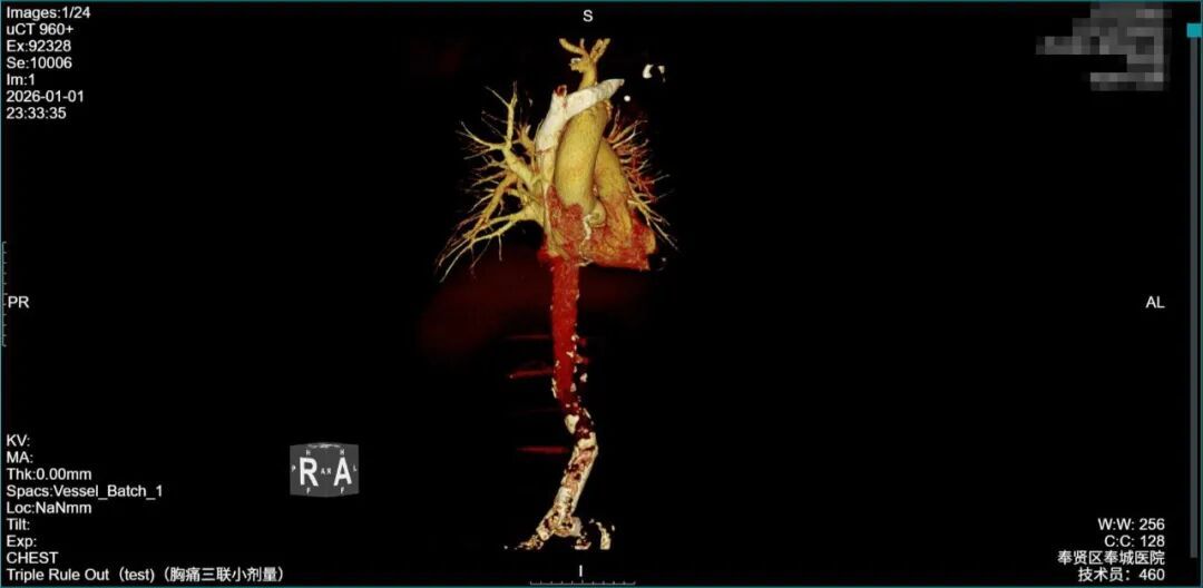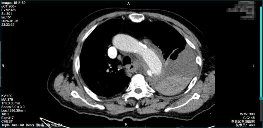 急诊团队凭借多年急危重症救治经验,瞬间判断这绝非普通胸痛!“立刻启动紧急救治绿色通道!”随着指令下达,吸氧、补液、心电监护等一系列生命支持措施同步进行。在患者血压极不稳定、无法长时间耐受检查的情况下,影像科团队火速到位,急诊增强CT血管成像(CTA)仅用15分钟就锁定“元凶”:主动脉夹层(StanfordB型)破裂!血液已涌入纵隔及左侧胸腔,形成巨大血肿,如同“血管破了个大洞”,每分每秒都在吞噬生命。