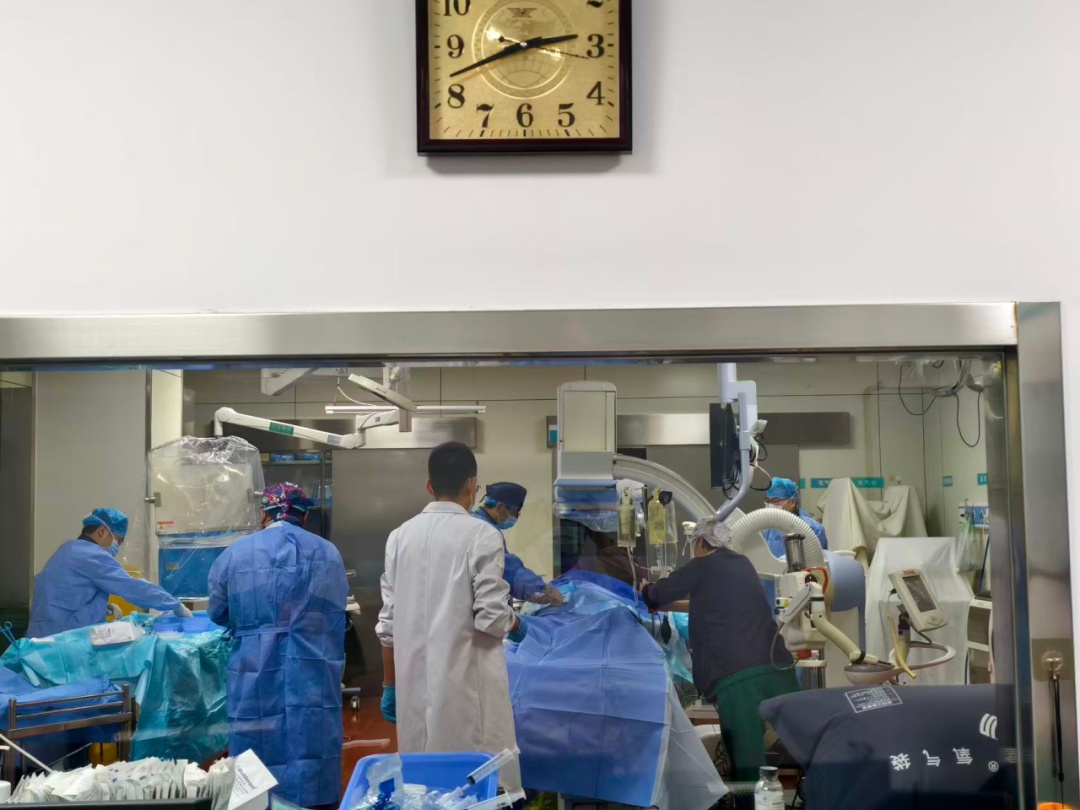 数字减影血管造影(DSA)的屏幕上,每一个操作都关乎生死。医生如同“血管里的拆弹专家”,在毫米级空间内操控器械,将覆膜支架稳稳输送至破裂处——“释放!”随着一声指令,支架瞬间展开,精准“堵”住主动脉破口,出血立即得到了有效控制!紧接着,团队再经左侧肱动脉穿刺,通过激光原位开窗技术为左侧锁骨上动脉“开辟通路”,成功完成血管重建。