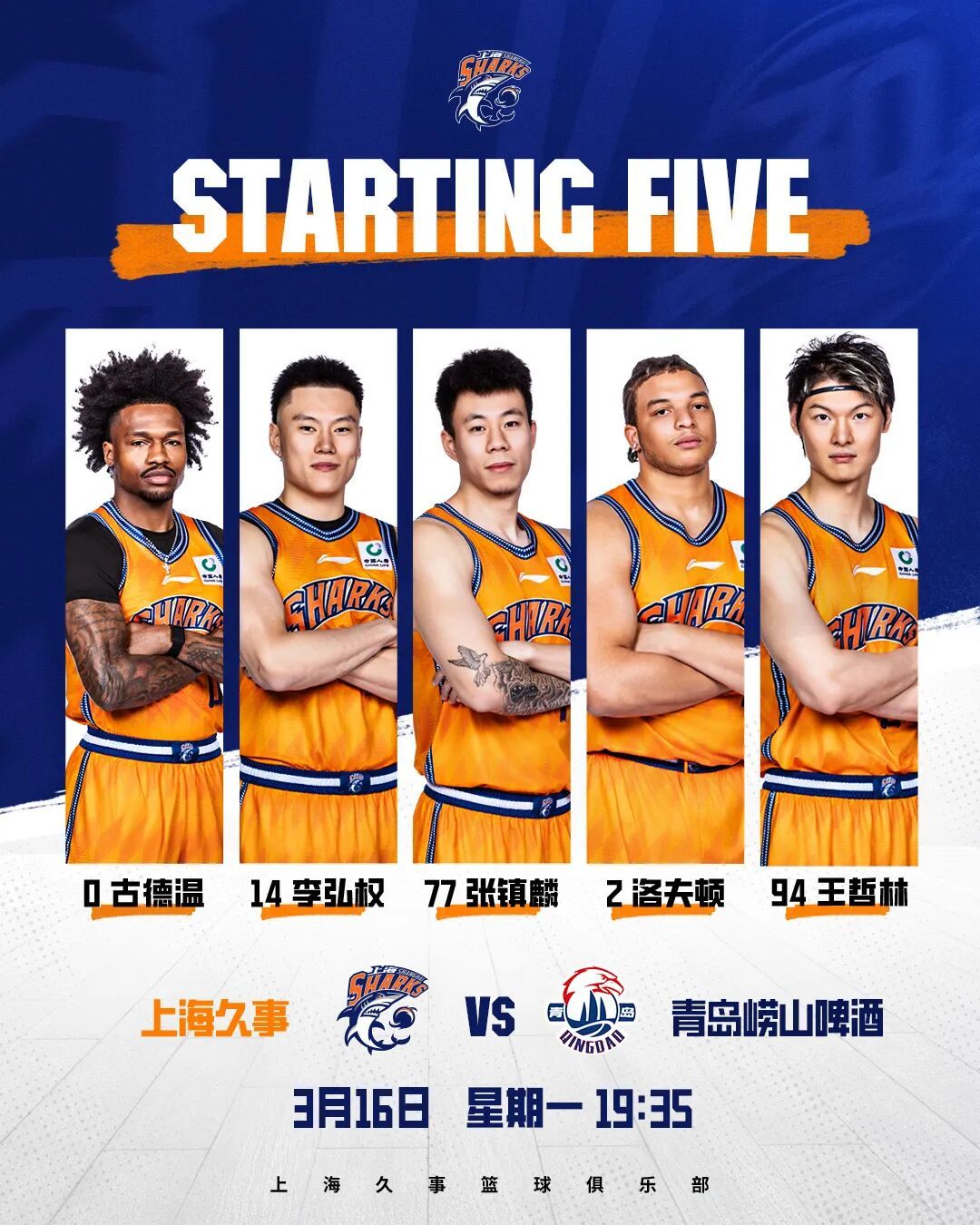 本场比赛上海男篮派出王哲林、张镇麟、李弘权和双外援洛夫顿、古德温的先发阵容,第一节大鲨鱼被对手投中4个三分球,而自己进攻方面失误太多,一度以12比19落后,被迫暂停。之后主队替补阵容上阵也发挥一般,分差逐渐被拉大到两位数,第一节以16比27落后。
