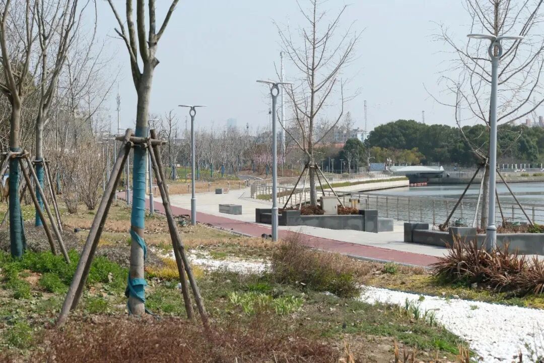 在紧邻苏州河的公园南区,伴随着蜿蜒的河道,步道、人行桥已全部落成,各类树木、花卉组成的景观小品相映成趣,映衬出层次丰富的绿色景观。沿着步道漫步,一幅完整的滨河生态画卷正徐徐展开。