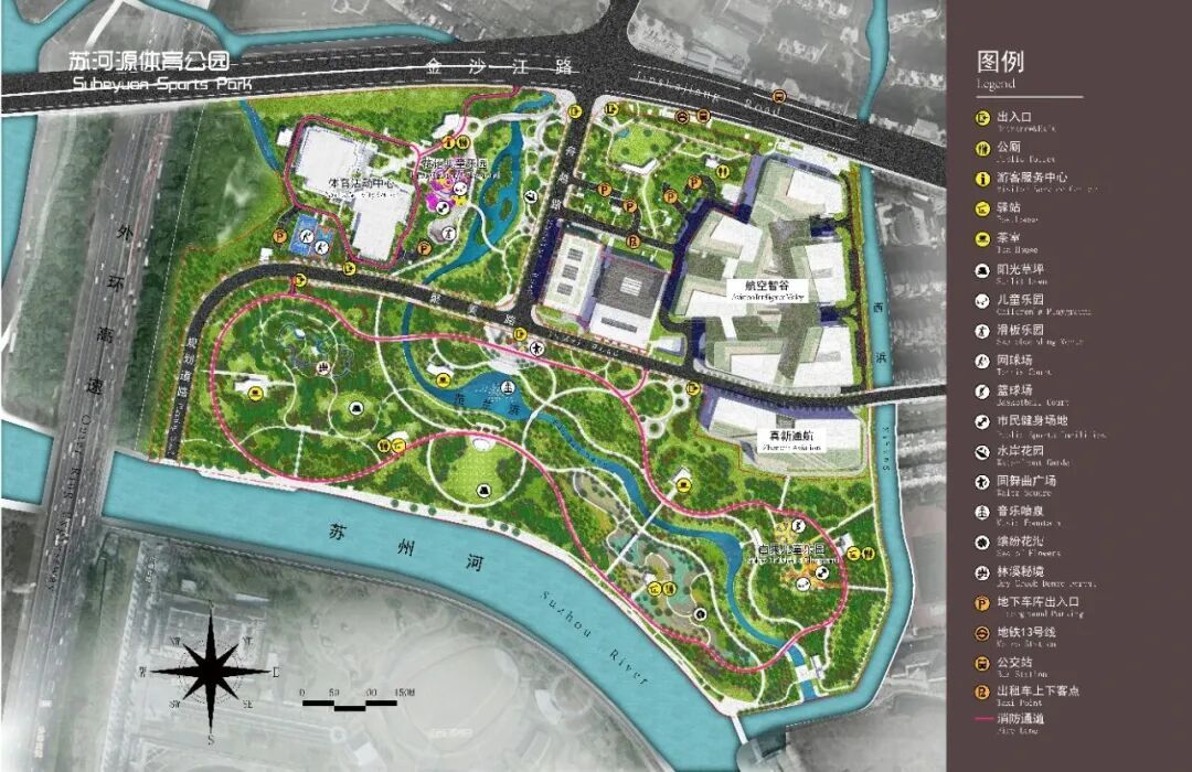 苏河源体育公园位于嘉定区真新街道,总占地面积约21.45公顷。公园分为南北两个区域,南区以适宜户外运动的大型绿地为主,北区则以体育中心为主,形成室外体育场所和室内体育场馆相结合的活力运动区。
