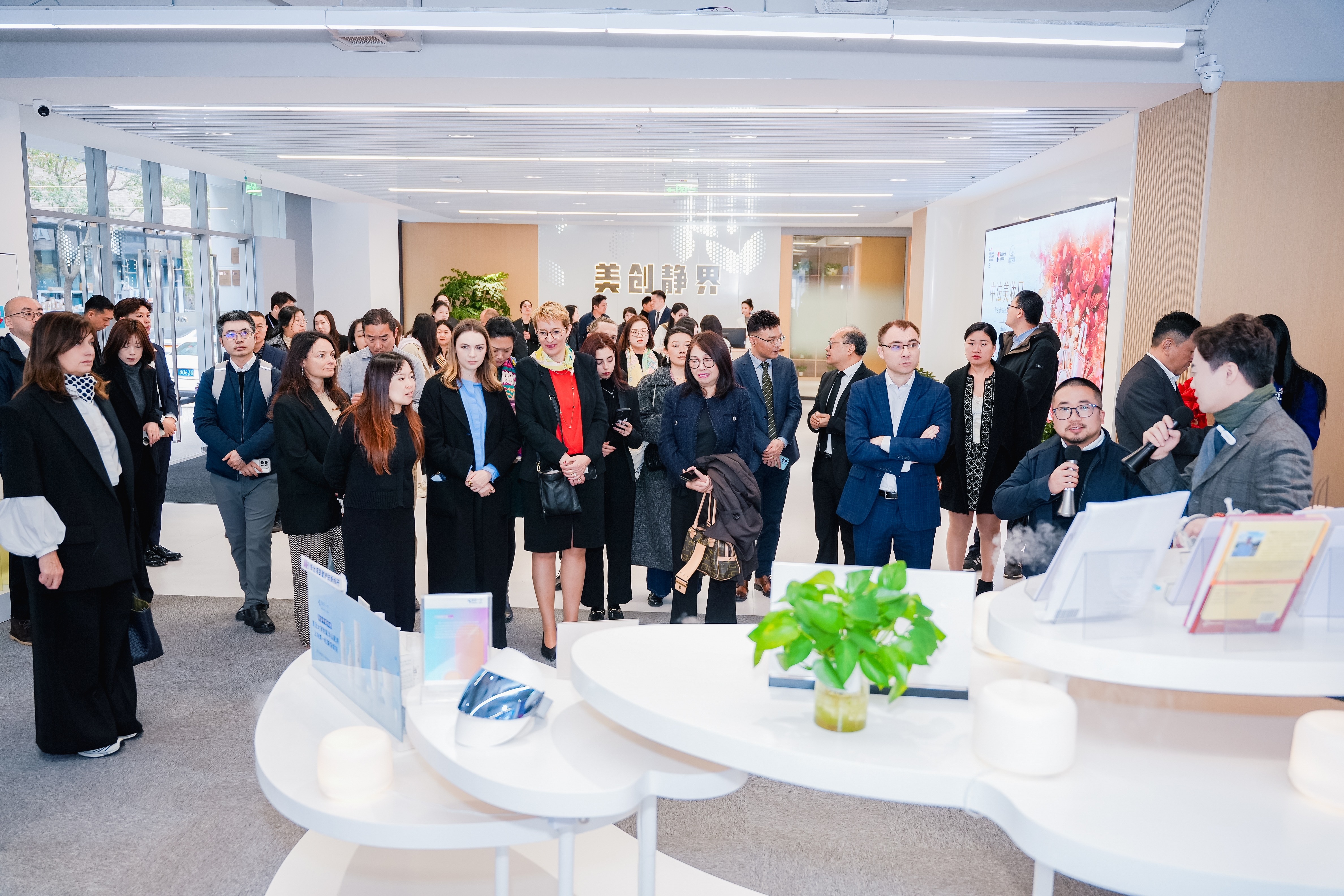 揭牌仪式后,嘉宾们实地探访“美创静界”,深入了解其“政、医、企”三维协同机制与产业生态构建。在精准对接环节,法方参展企业与“美创静界”10家入驻企业代表围绕技术研发、资源整合及市场拓展等议题展开深度洽谈,为后续跨国合作奠定坚实基础。