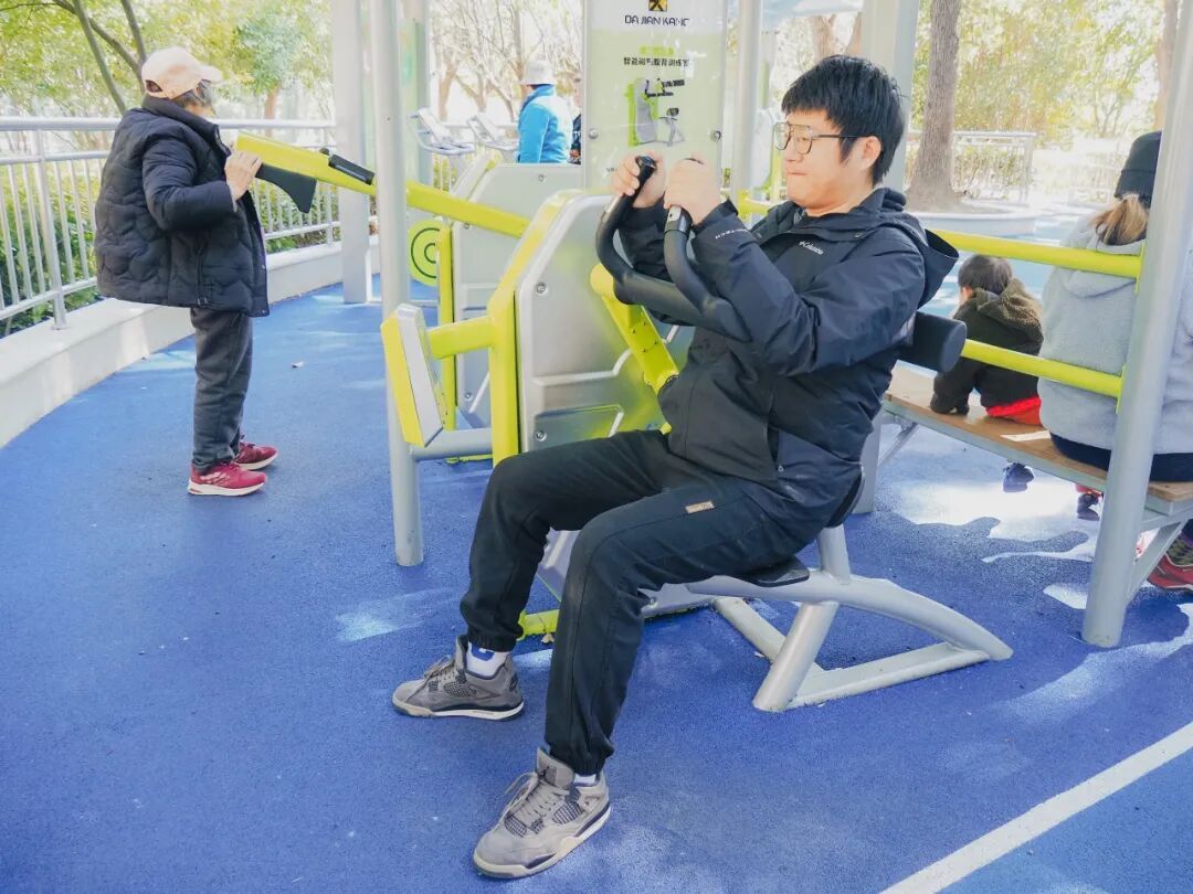 通过蜿蜒曲折的健身步道分别打卡两片区域,只见A区为智能健身区,B区为亲子互动区。其中,A区最大的特点是引入了第三代智能健身器材,相比以往设备,新一代器材不仅能够显示运动数据,还能提供直观的互动体验。例如,居民可以在户外体测机上完成身高、体重、体脂率、握力、纵跳、闭眼单脚站立、血氧饱和度等11项体测项目,对身体状况进行快速评估。周边配置的健身器材则为智能磁阻训练器,可针对腿部力量、核心肌群、上肢力量等进行专项训练。运动过程中,设备能实时显示运动时间、次数以及卡路里消耗等数据,甚至根据运动量进行双人PK。