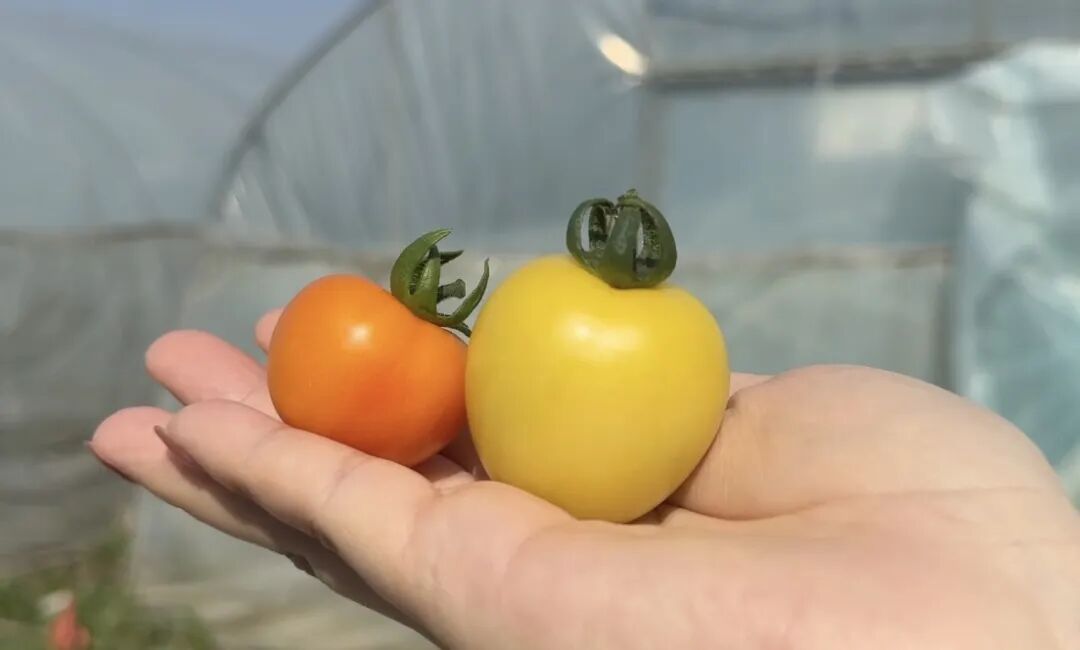走进金山区番茄研发中心的种植大棚,满目皆是垂挂的“小灯笼”——红色热烈、黄色明艳,各色小番茄琳琅满目,组成了一片缤纷的“番茄森林”。在这片色彩海洋中,两款新品尤为抢眼:一种黄中透白,温润如玉,名为“慕容”;另一种色泽橙红鲜亮,形似小柿子,名叫“桃香橙橘”。据介绍,它们都是去年从广东引进的优质新品种。