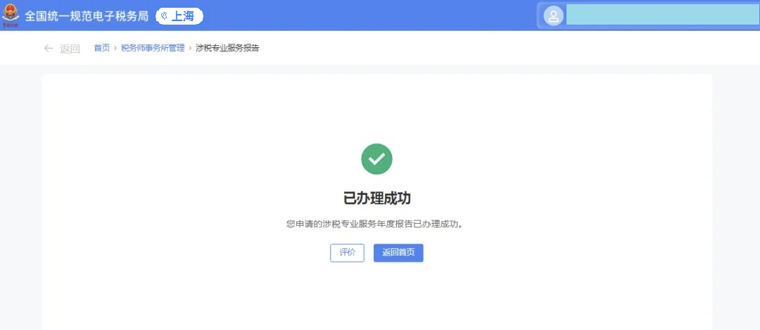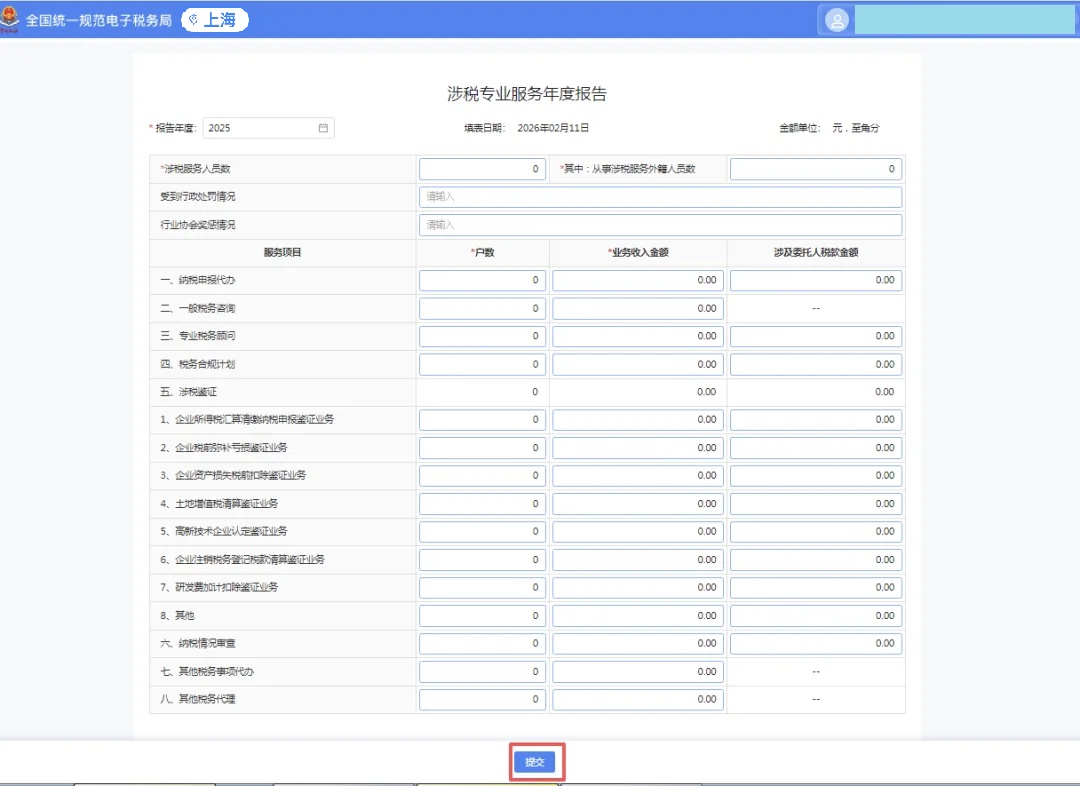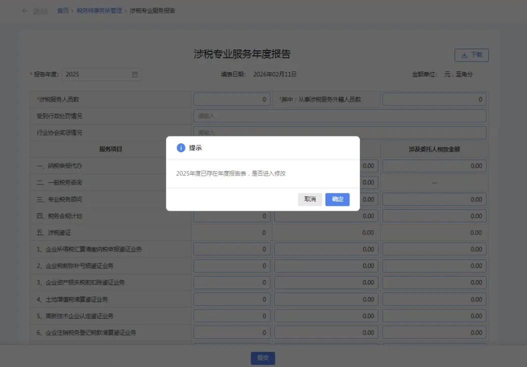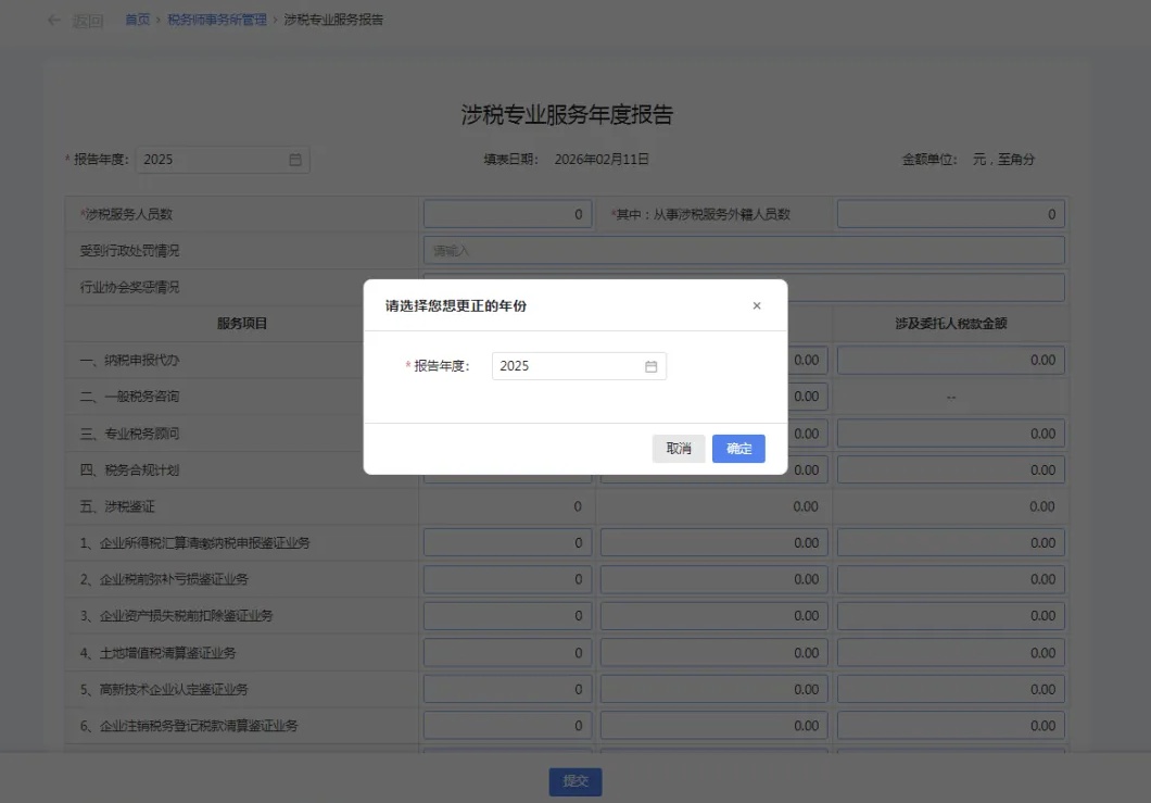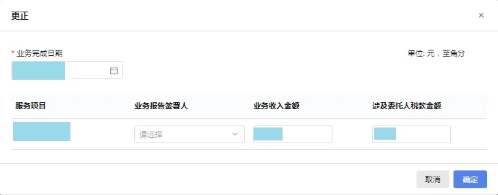 录入业务完成日期、业务报告签署人(填写有助于提高信用积分)、业务收入金额、涉及委托人税款金额等信息,核对无误后确认提交即可。