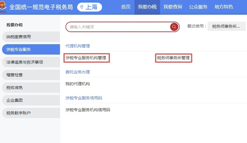 涉税专业服务机构通过“企业业务”登录电子税务局后,可依次点击【我要办税】—【涉税专业服务】—【代理机构管理】—【涉税专业服务机构管理】办理报送业务;其中,税务师事务所需通过【税务师事务所管理】模块进行报送。也可直接在搜索栏中输入“涉税专业服务机构管理”或“税务师事务所管理”,快速进入对应办理模块。