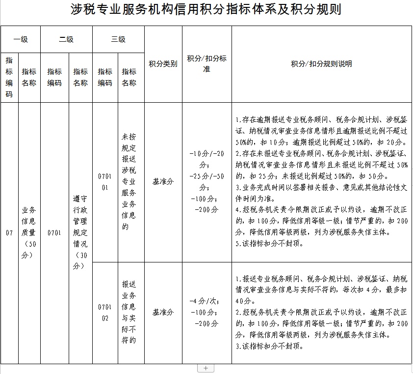 根据《国家税务总局关于发布<涉税专业服务信用评价管理办法>的公告》(国家税务总局公告2026年第1号)中《涉税专业服务机构信用积分指标体系及积分规则》规定,未按规定报送涉税专业服务业务信息的或报送业务信息与实际不符的,将会对涉税专业服务机构视情形分别给予扣减信用积分、降低信用等级、列为涉税服务失信主体等处理。具体规则请对照下表: