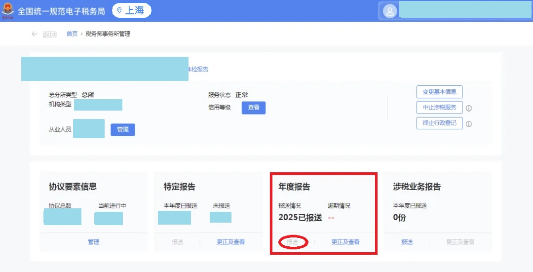 进入“涉税专业服务机构管理”功能界面后,若存在未报送的年度报告,【报送】按钮将显示为蓝色;完成年度报告报送后,【报送】按钮则会变为灰色。