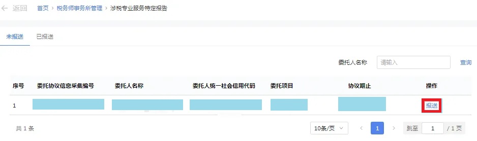 进入特定报告页面后,选择对应委托协议,点击【报送】按钮。