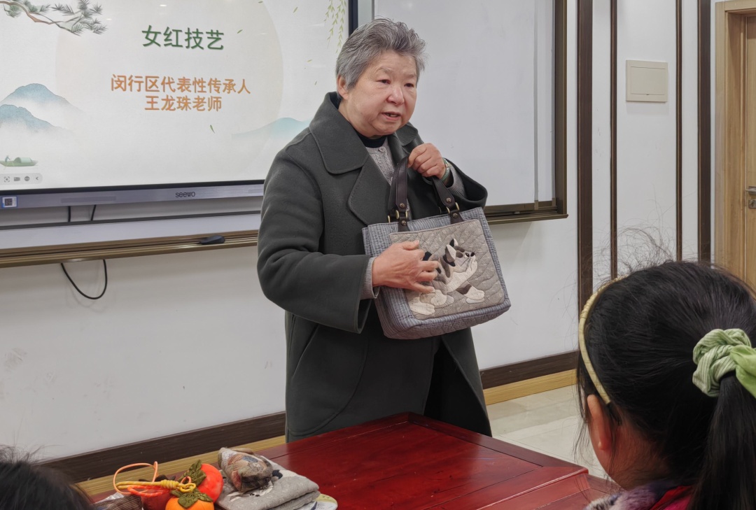 十六年来,国家级传承人赵雪林坚持亲自上课。他最看重的,是学校对师资的“造血”能力。如今,学校的音乐老师梅杨已成长为项目的区级代表性传承人,而学校当年培养的第一批学生里,也有人成为了马桥交大实验学校的老师。今年,他主动回到母校搭建的马桥手狮舞工作坊深造,从学生变成了新一代非遗传承者。如果说强恕是“深耕”,那么金汇高中的“古旧木器修缮”课程则是精准的“新植”。学校选择开这门非遗课,校长杨希有着深远的考量:高中生学业压力大,需要一种能提供“即时反馈”的活动来激发内驱力。更重要的是,木器修缮融合了历史、物理、美术等多学科知识,且蕴含着“静心、专注、有毅力”的工匠精神。杨希希望,学生能将在修缮木器时磨炼出的那份定力,迁移到日常的学习中。古旧木器修缮技艺区级代表性传承人袁金祥在金汇高中开讲今年开学,学校邀请“上海工匠”袁金祥进校,首节课从明清家具的审美理论讲起,在古色古香的教室里开启了审美启蒙。这个项目与高中必修的“技术与工程”课程深度结合,利用了校内现成的国学教室作为展示空间。为了让非遗课程更好更长久的留在学校,课程也同步启动了“教师工作坊”,选派老师跟岗学习,培养“种子教师”让课程能够长期扎根学校。长期以来,闵行区的非遗进校园活动以零散对接、短期体验为主,未形成长效体系。一方面,学生难以系统了解非遗全貌,另一方面,学校虽渴求优质资源,却常面临甄别难、引入难的困境。2026年春季,闵行区14所学校同步开启“非遗在校园”项目,这标志着全区非遗传承进入了从“零散对接”向“系统化推进”的实质性转变,学校设置的非遗课程也从“短期体验”转向“长期深耕”。上海交通大学附属实验小学“2026非遗第一课” :女红技艺(布艺)区文化旅游局与教育局联手,各街镇提供属地保障,通过精准配送非遗资源,破解了以往“学校想引引不进、传承人想进进不来”的难题,让非遗课程真正沉得下、留得住。各校根据学生年龄特点精准设计课程:小学重体验,中学重实践,高中重审美与精神塑造,使非遗传承更贴合学生成长规律。上海中医药大学附属闵行晶城中学“2026非遗第一课”:香囊制作技艺