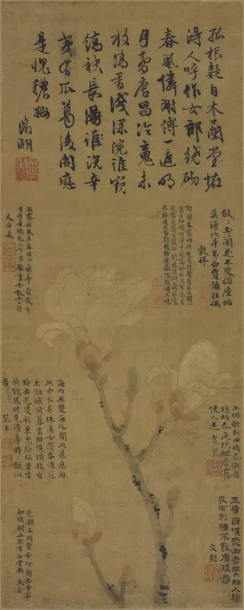 嘉靖二年,文徵明进京参与编修《武宗实录》,目睹朝局险恶,顿起归心。嘉靖四年,文徵明五十六岁时作《秋夜不寐枕上口占五首》,其一云:“中夜无眠思故乡,梦成刚在玉兰堂;深泥不恨无行辙,新水还堪着野航。草色帘栊春雨足,绿阳门巷午风凉。谁令抛却幽居乐,掉鞅来穿虎豹场。”官场如虎豹场,他愈加怀念幽居之乐。此刻,玉兰是他郁结心情下的一味舒缓风景。