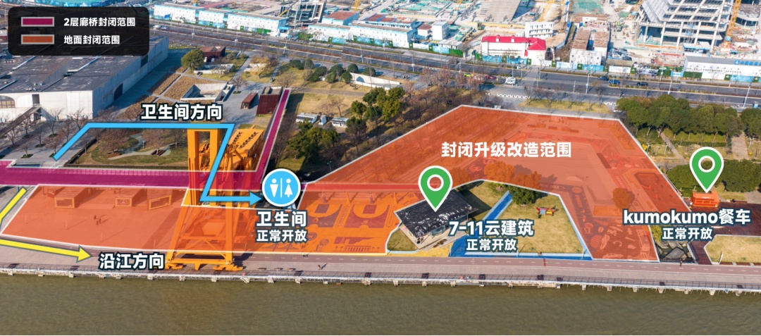 根据“上海西岸”微信公众号信息,3月18日起,徐汇滨江adidas RUNBASE、滑板公园、篮球场等区域升级改造暂停开放。公告全文如下: 各位市民游客请注意,为进一步提升出行体验,我们将对沿江公共空间进行局部升级焕新改造,并对部分区域临时封闭管理。 以下区域将自3月18日起临时暂停开放: ·滑板广场 ·篮球场 ·WEST BUND BOX ·adidas RUNBASE及其东侧广场 ·海上廊桥(即二层高架步道)部分区域 以下场所照常开放: ·adidas RUNBASE北侧公共卫生间 ·7-11便利店 ·KUMO KUMO餐车 ·滑板公园周围各商户 相关恢复开放时间,敬请关注后续发布! 暂停开放区域示意图,具体围合边界以现场为准