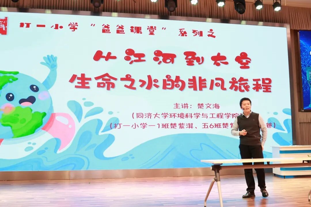 在特色环节“爸爸课堂”中,同济大学环境科学与工程学院教授楚文海把同济大学优质课程带入小学,以“从江河到太空——生命之水的非凡旅程”为主题,通过问题引导与动手实验相结合的方式,带领孩子们用数学思维探索科学原理,在实践中感悟气象知识与环保理念的生活应用。
