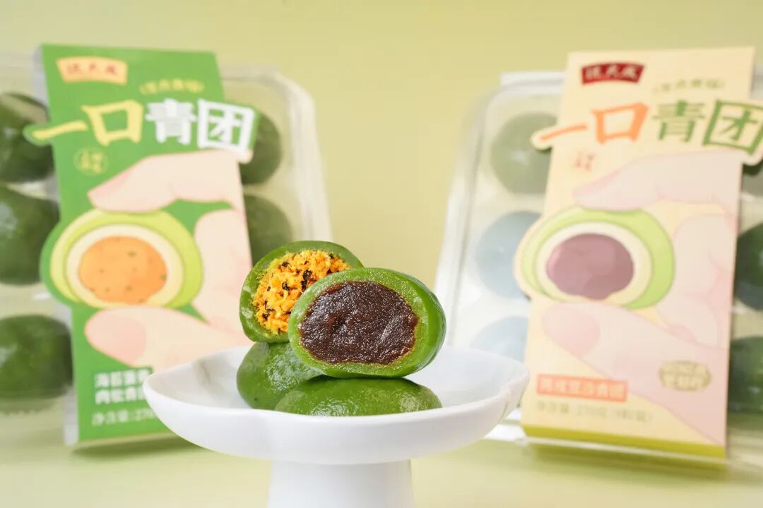 在守正创新之路上,沈大成今年亦有新举动。除了爆款土豆泥培根口味,品牌还推出了一款“迷你”青团——一口青团(部分线下门店有售)。传统青团每只约重100克,而“一口青团”仅30克,真正做到一口一个。新品提供海苔蛋黄肉松与陈皮豆沙两种口味,以满足消费者不同的尝鲜需求。