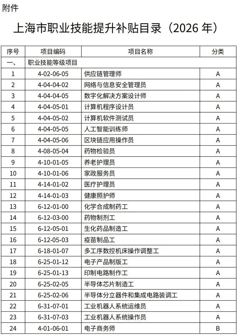 2026年上海市职业技能提升补贴目录即日起正式落地。符合条件的劳动者考取证书后,能在“随申办市民云”【技能提升补贴申请】服务在线申请补贴。