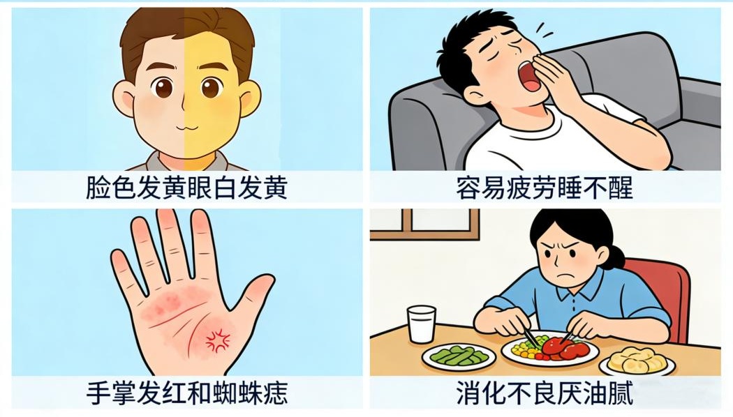 ■容易疲劳、睡不醒(乏力)■手掌发红(肝掌)、身上出现蜘蛛痣