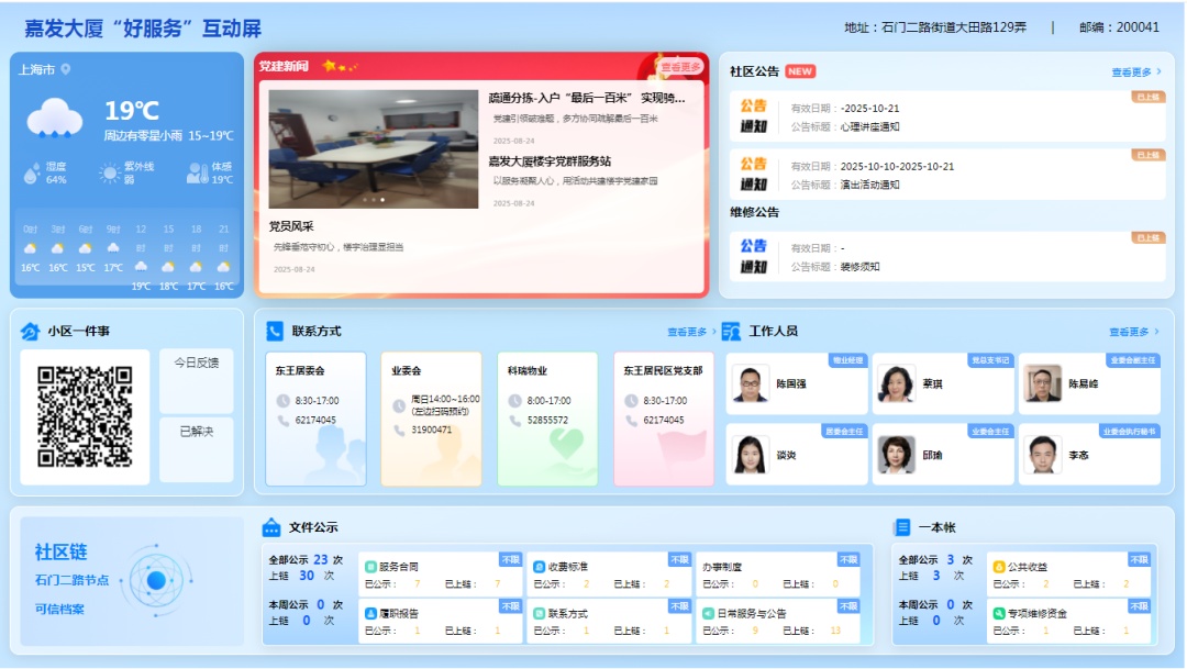 强化数据底座赋能。一体运营阵地空间,推出三栋楼的三种功能排片,通过活动实时发、空间人流动态测、智能客服随时伴,提升运营效率。另一方面,赋能治理。围绕“一降三升”要求,揭榜领题商住混合小区物业治理难题,携手浦江数链开展“链上党建”,联合市物业管理事务中心试点电子投票,推广应用区块链技术打造“透明物业”解决信任难题。开展“解民忧 提品质”专项大走访,群租类、物业管理类和噪声扰民类工单平均下降31.5%。