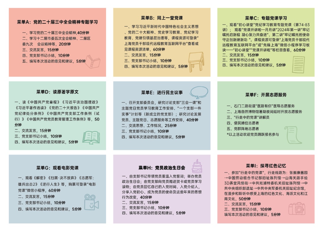 突出“引领”,强化政治功能支撑。结合月度工作提示,推出“每周一菜”,形成定制化组织生活套餐,打造“支部柜”“支部日历”“支部树”,形成“评弹党课”“VR党课”等供给菜单。搭配5分钟、15分钟、30分钟“一扫即学”暖“新”学习包,针对流动党员推出暖“流”八条举措。
