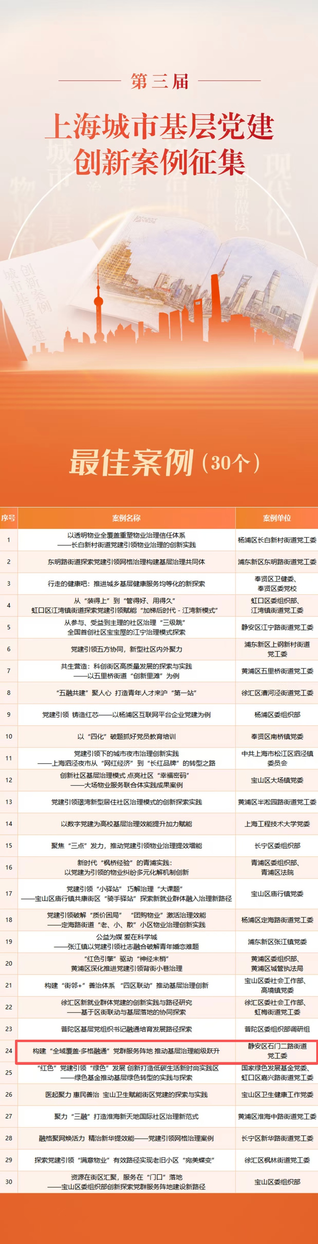 近日,第三届上海城市基层党建创新案例征集活动推荐案例名单正式发布,100个具有代表性和可复制性的案例脱颖而出,其中最佳案例30个、优秀案例30个、入围案例40个。