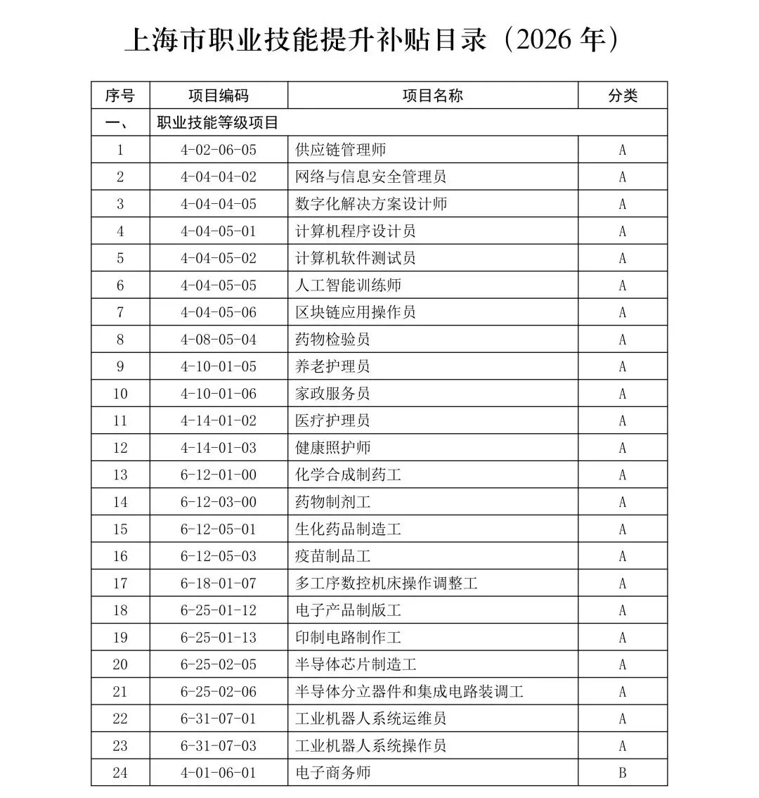 考什么证书可以申领补贴?哪些工种符合申领条件?《上海市职业技能提升补贴目录(2026年)》已于今年三月全面实施。新版目录围绕本市重点产业发展与技能人才队伍建设需要,对A类(重点支持)、B类(急需紧缺)、C类(其它补贴)项目进行了系统优化与动态调整,进一步将供应链管理师等一批项目纳入A类重点支持范围,并新增了健康照护师等职业,同时对B类、C类及部分技岗匹配项目进行了更新。 若符合条件,可以在考取后申领相应补贴。完整版的目录给大家贴在这儿啦,各位也可以点击文末阅读原文下载目录查看↓ 职业技能提升补贴标准 A 类项目职业技能证书补贴标准: 初级工(五级)1950元/人 中级工(四级)2600元/人 高级工(三级)3250元/人 技师(二级)3900元/人 高级技师(一级)4550元/人 不区分等级的职业资格和专项职业能力证书1000元/人 B 类项目职业技能证书补贴标准: 初级工(五级)1500 元/人 中级工(四级)2000元/人 高级工(三级)2700元/人 技师(二级)3200元/人 高级技师(一级)3700元/人 不区分等级的职业资格和专项职业能力证书800元/人 C 类项目职业技能证书补贴标准: 初级工(五级)、中级工(四级)800元/人 高级工(三级)、技师(二级)、高级技师(一 级)1500元/人 不区分等级的职业资格和专项职业能力证书500元/人 资料:上海人力资源和社会保障 编辑:王雨思