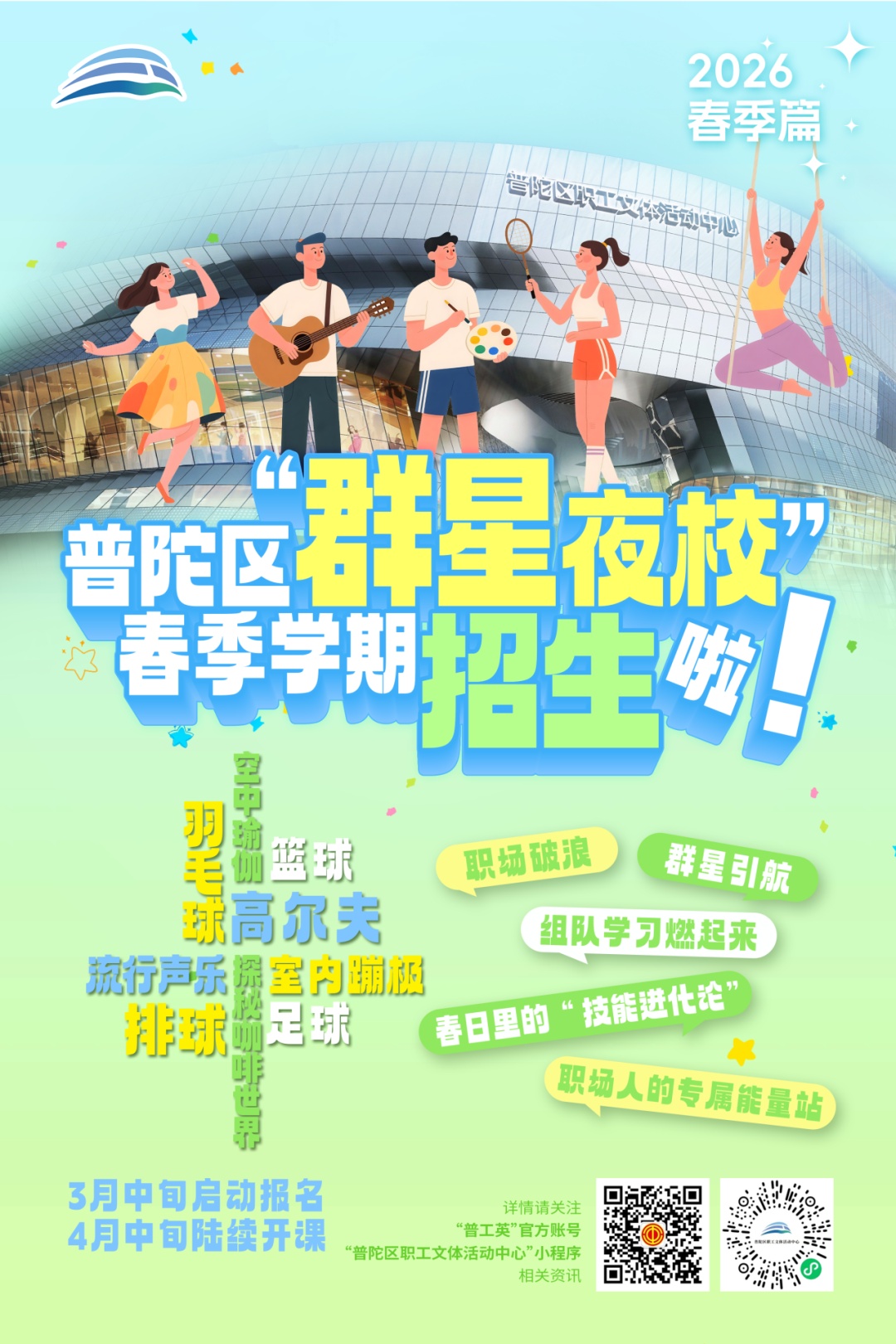 春日焕新,来学新技。职场充电、运动撒欢、亲子趣学,一站式解锁春日美好。2026年普陀区“群星夜校”春季学期全新上线,超多宝藏课程已就位,就等热爱生活的你。AI赋能领航职场;篮球、羽毛球挥汗赛场;高尔夫解锁优雅运动新体验;室内蹦极、空中瑜伽玩转潮流健身;流行声乐唱响春日篇章;咖啡进阶、茶道文化尽享生活格调;还有亲子篮球、排球、足球同玩同乐,全家共赴成长之旅。